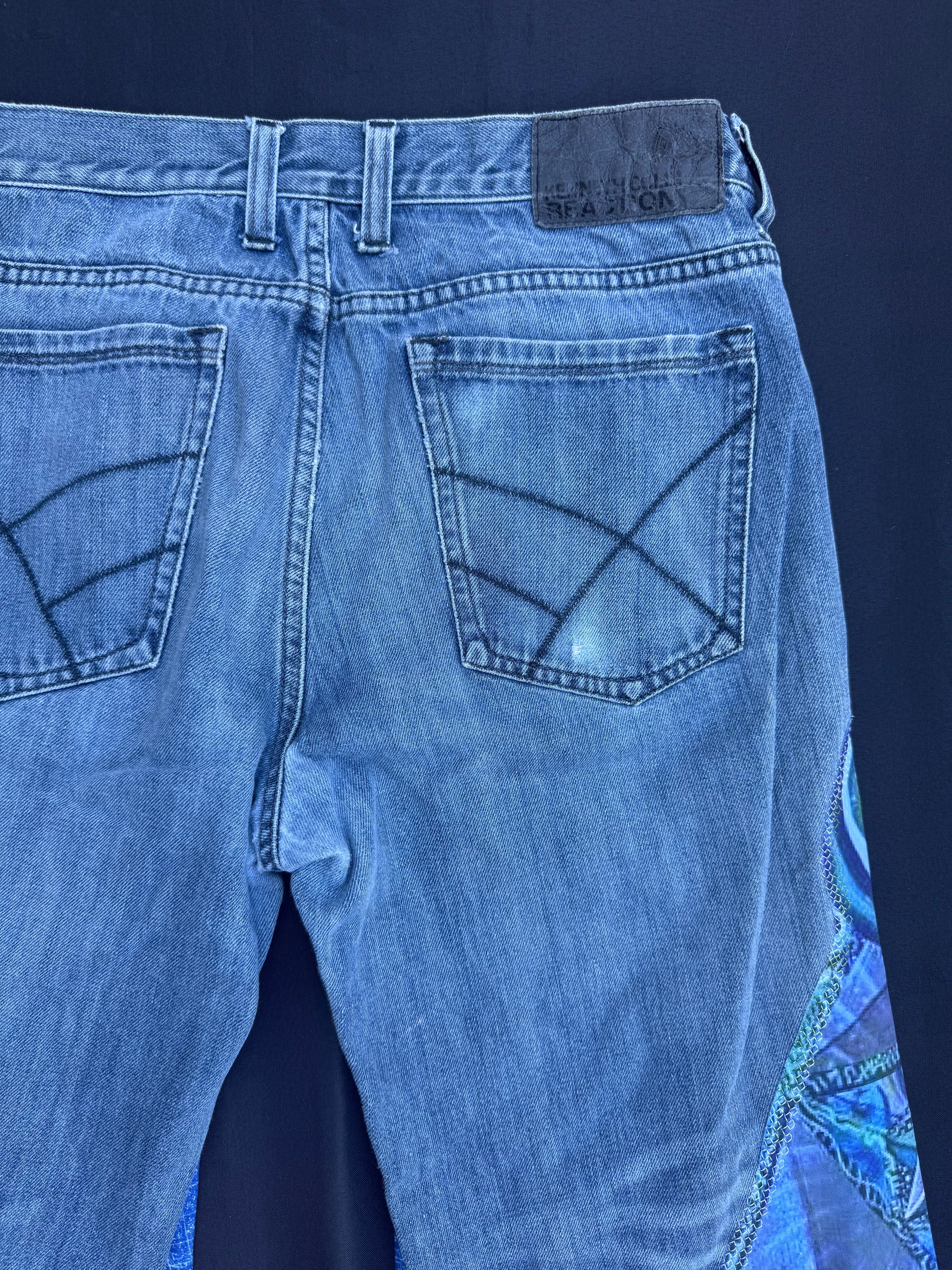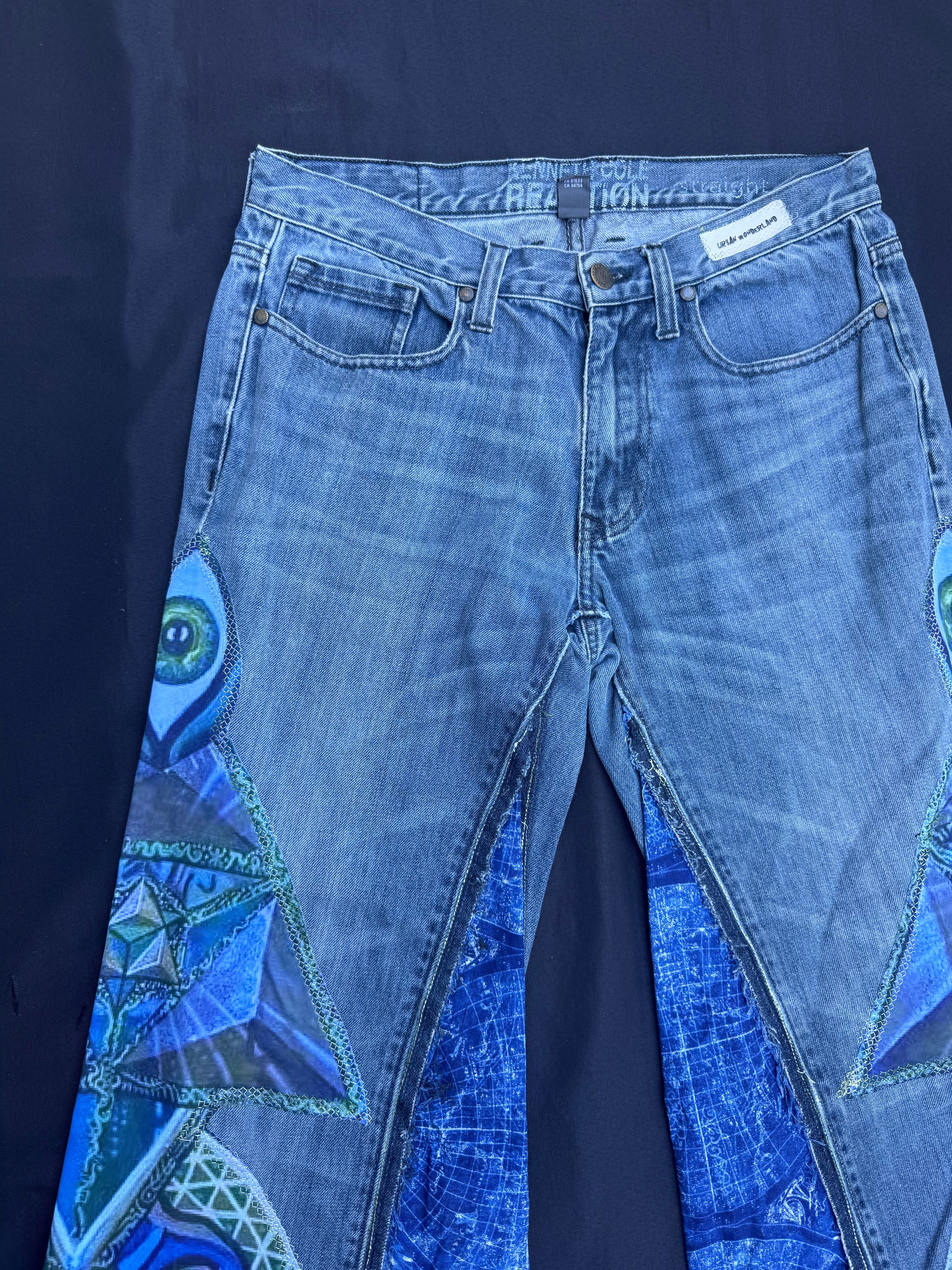 Upcycled Kennith Cole jeans using fabric with art by Jesse James (@jessejames_vv).