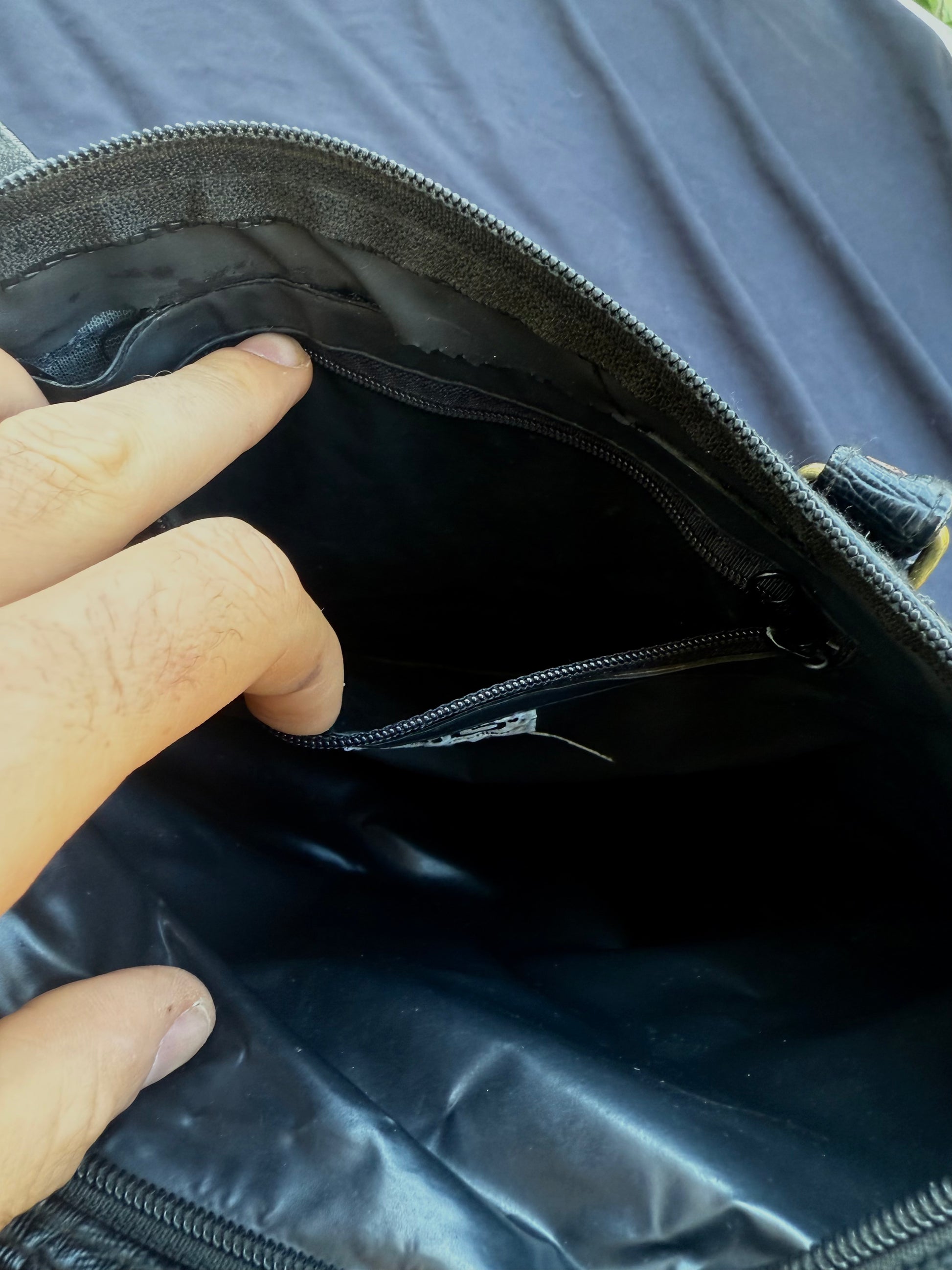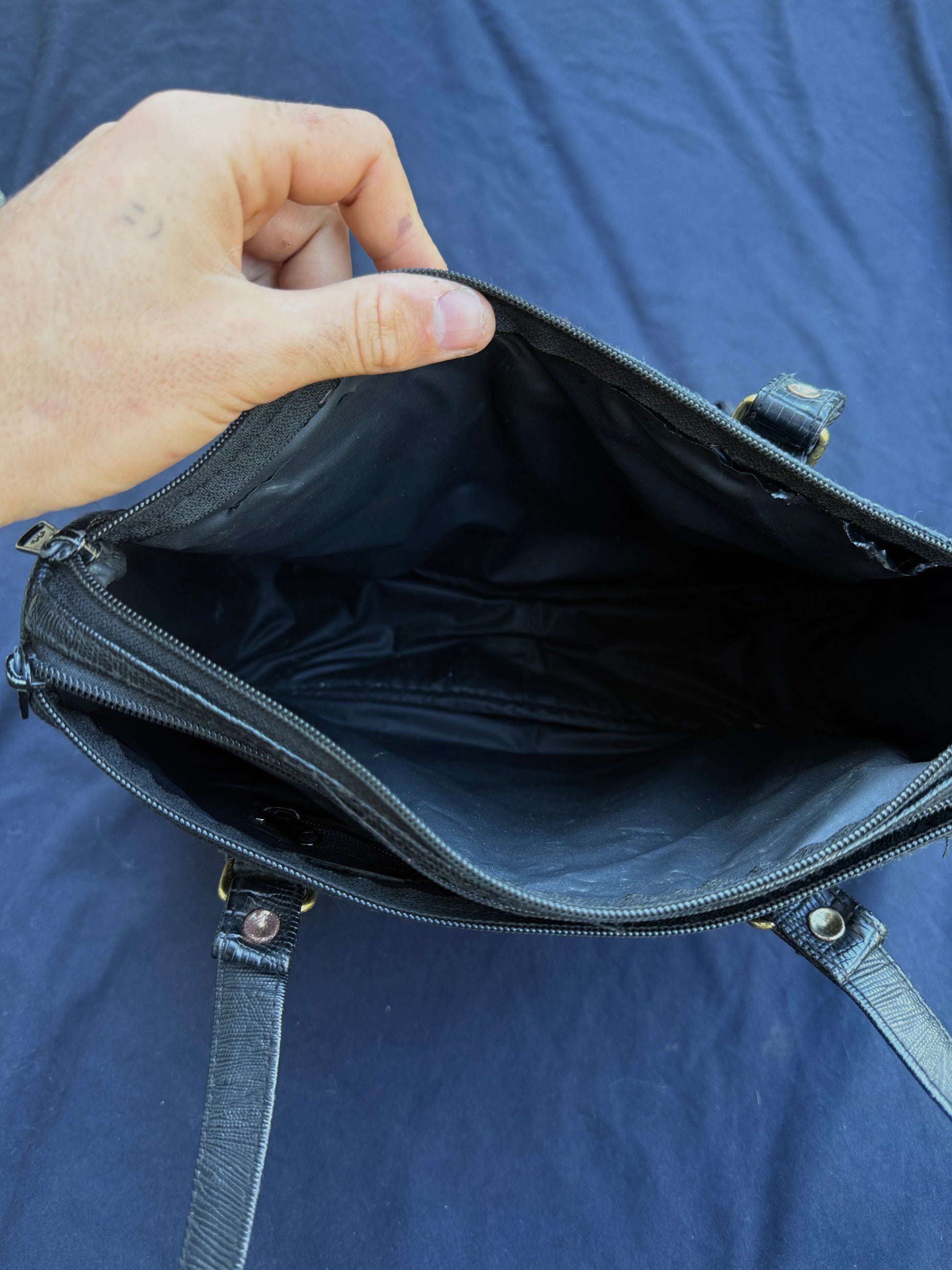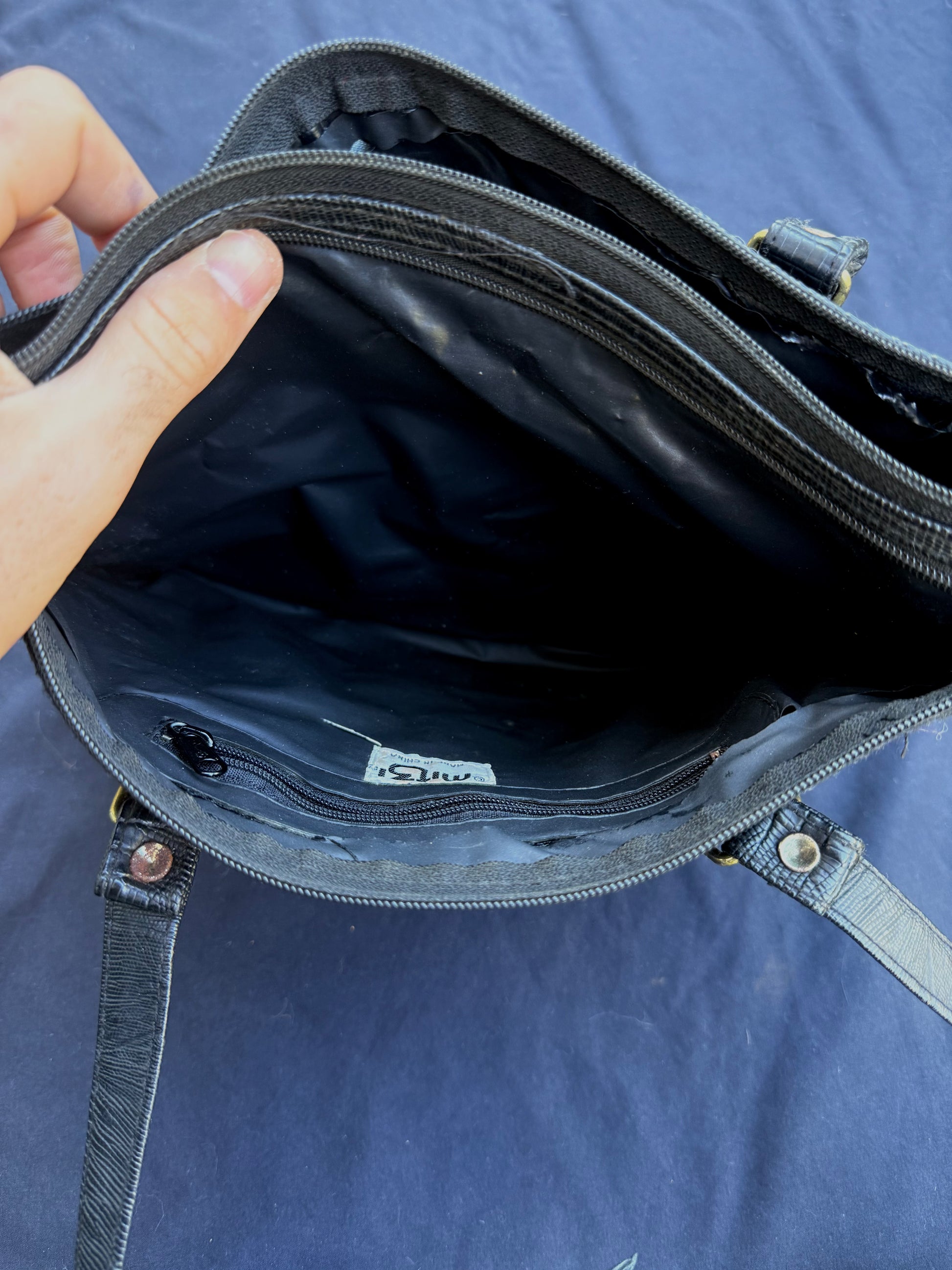 Purse has two large main compartments with one smaller zipper pocket.