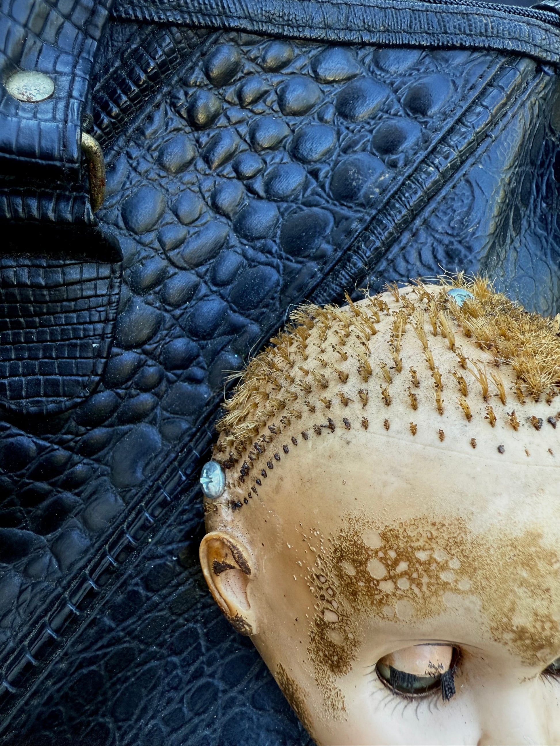 Crocodile patterned black faux leather.