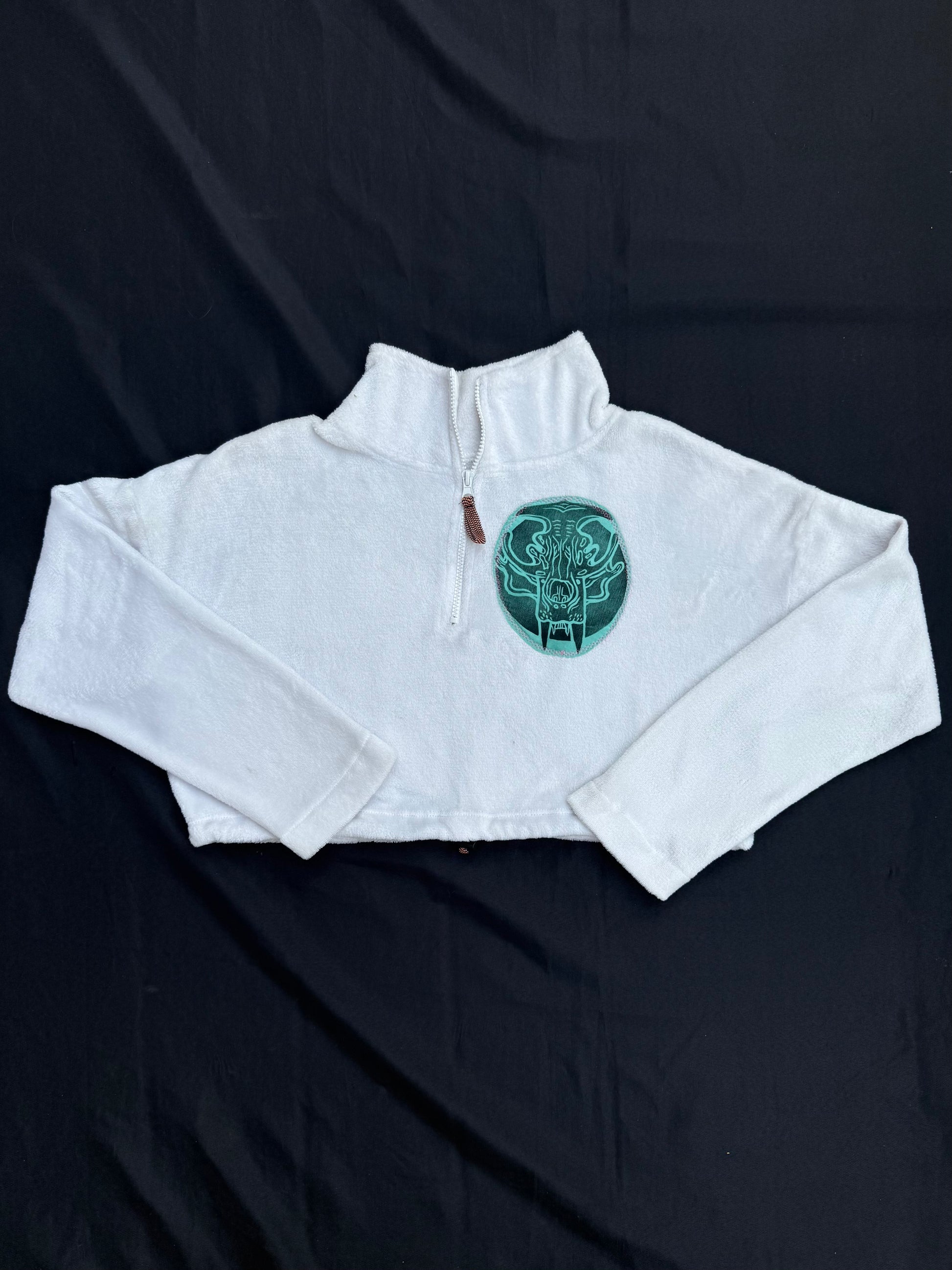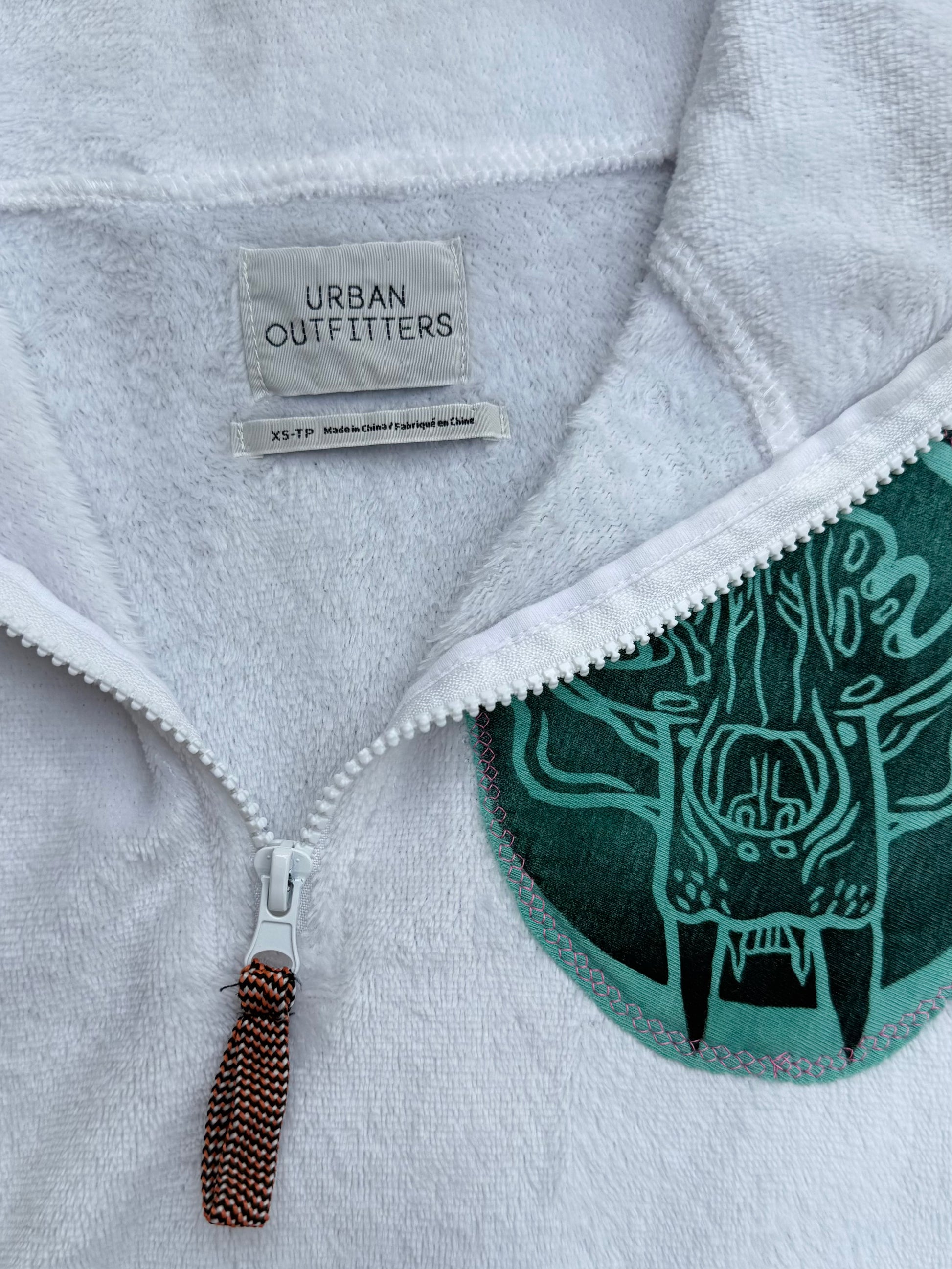 Polar bear skull linoleum block printed patch designed, carved and printed by Gibbe.