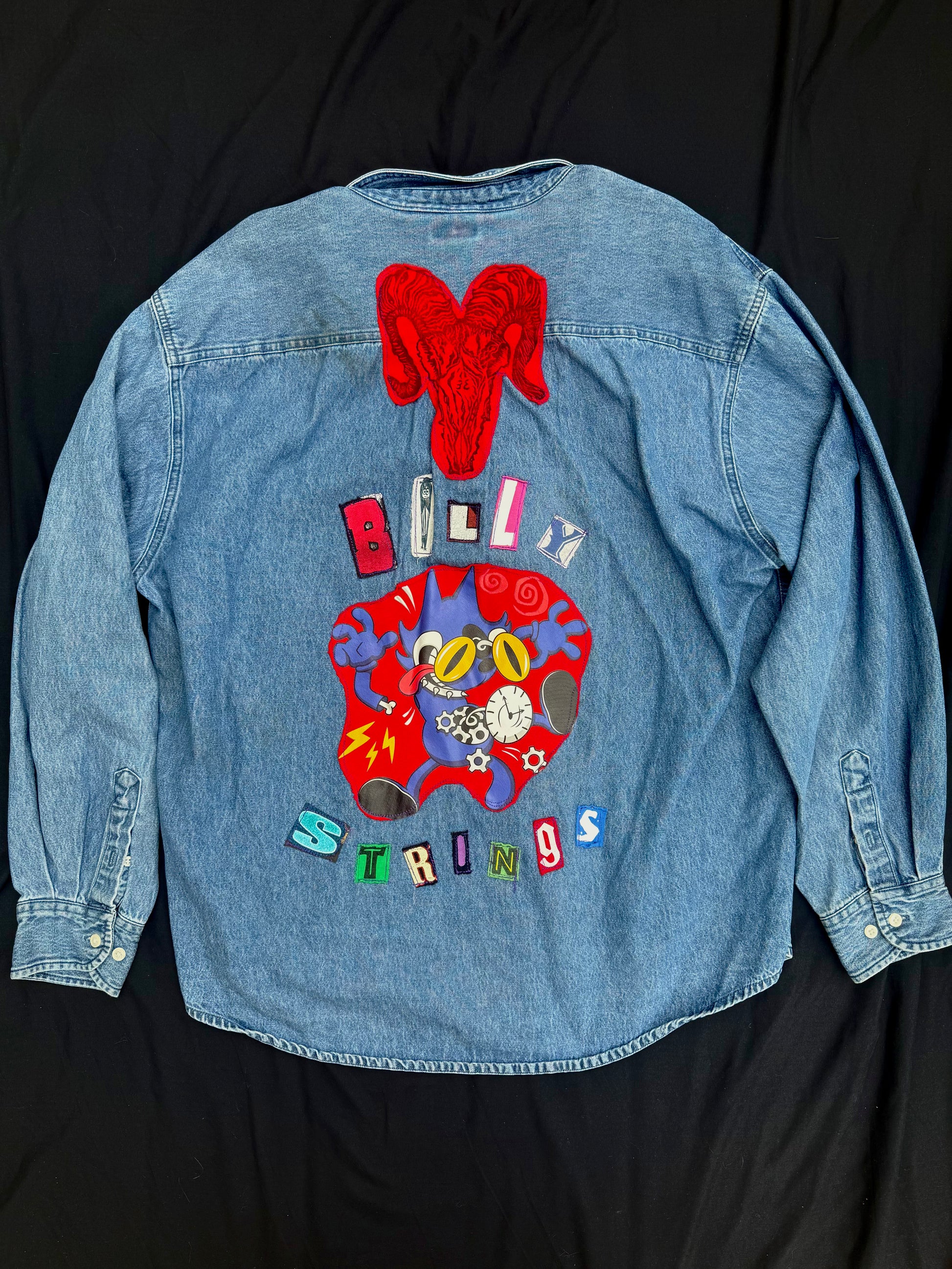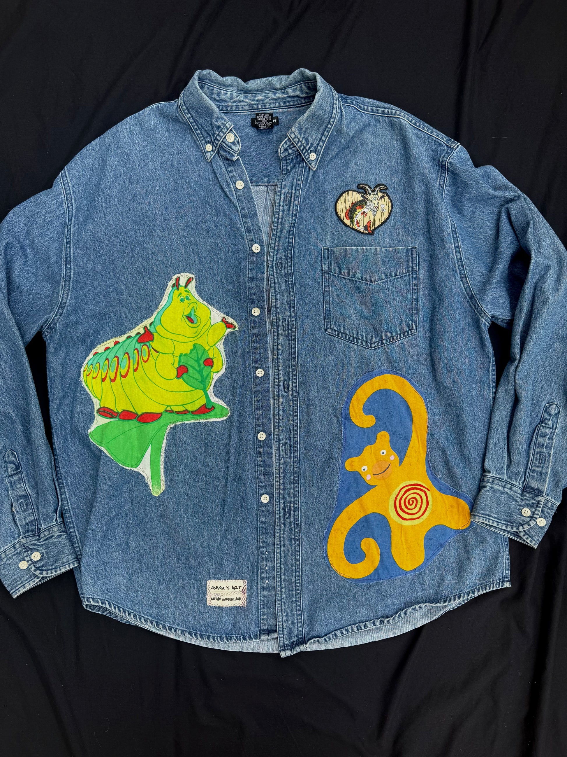 All letters are cut out from different thrifted shirts and sewn onto the shirt.