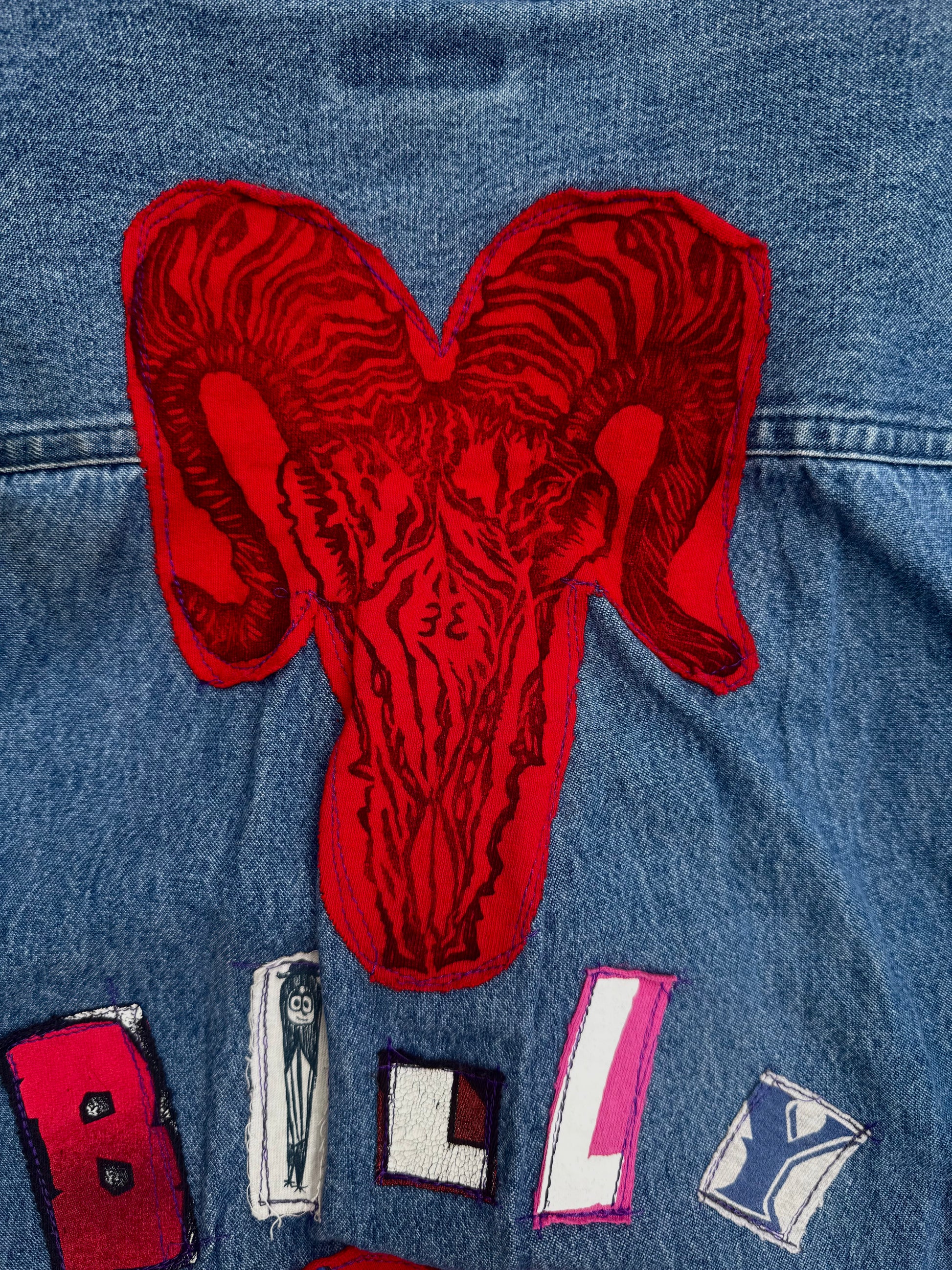 The all seeing billy goat skull is a linoleum block printed patch designed, carved and printed by Gibbe.