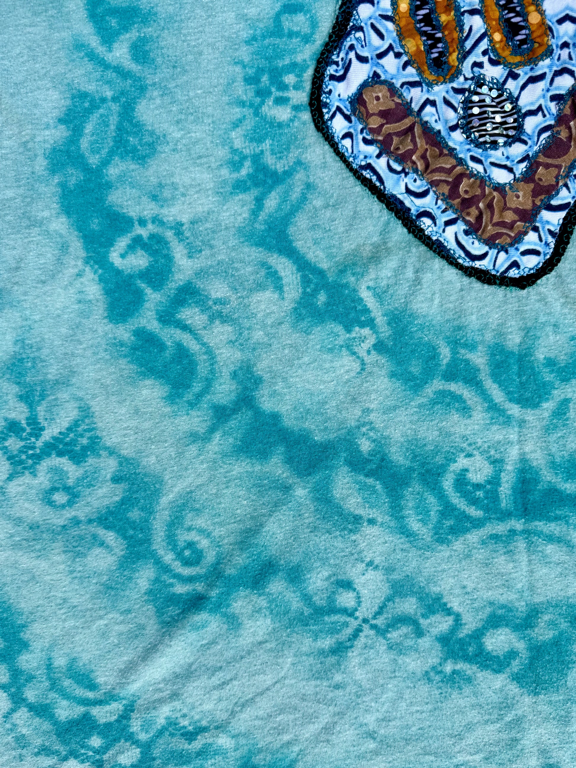 Clown patch created with scrap fabrics, sewn onto t-shirt with bleach dyed spiral by Bam.
