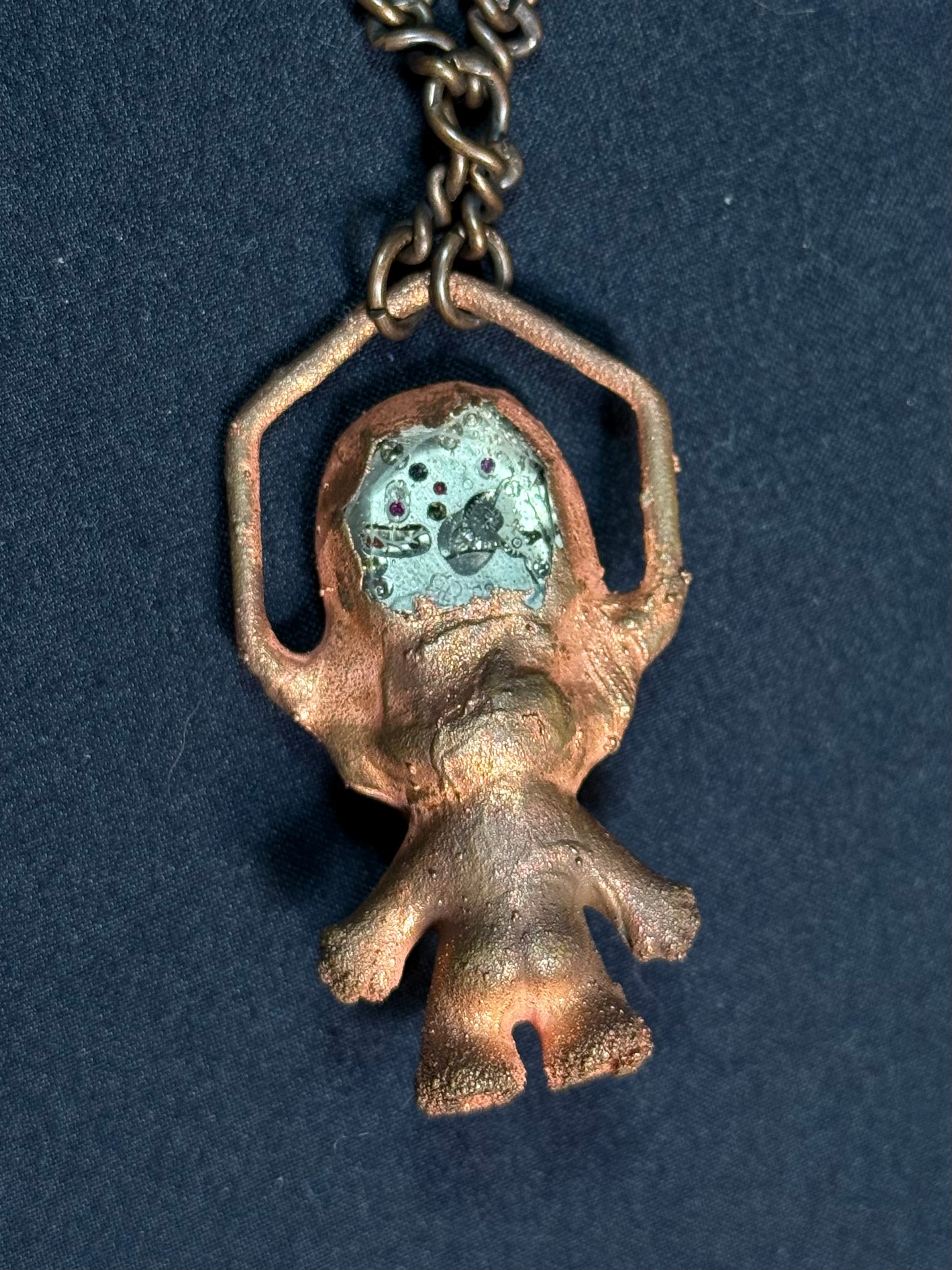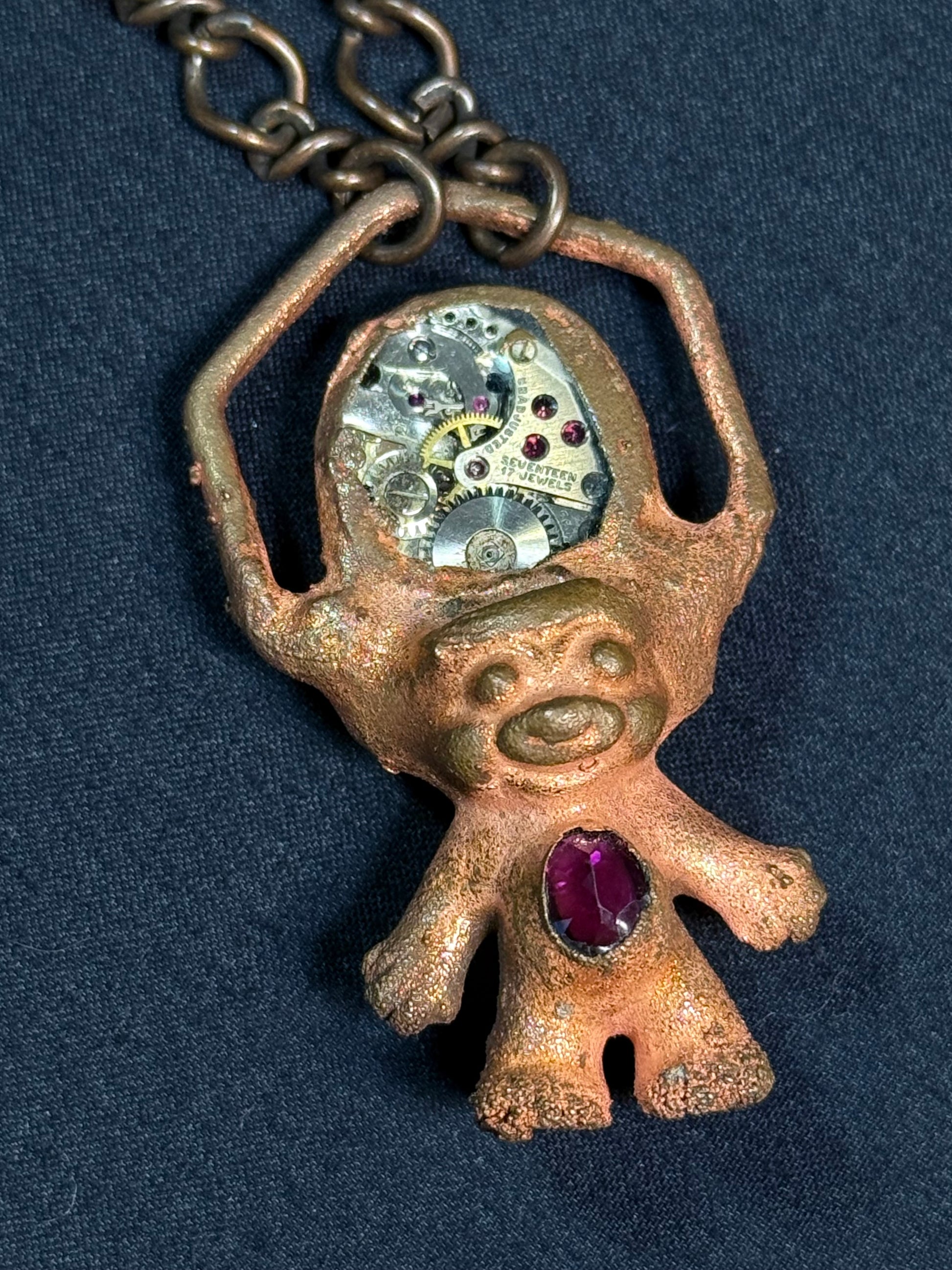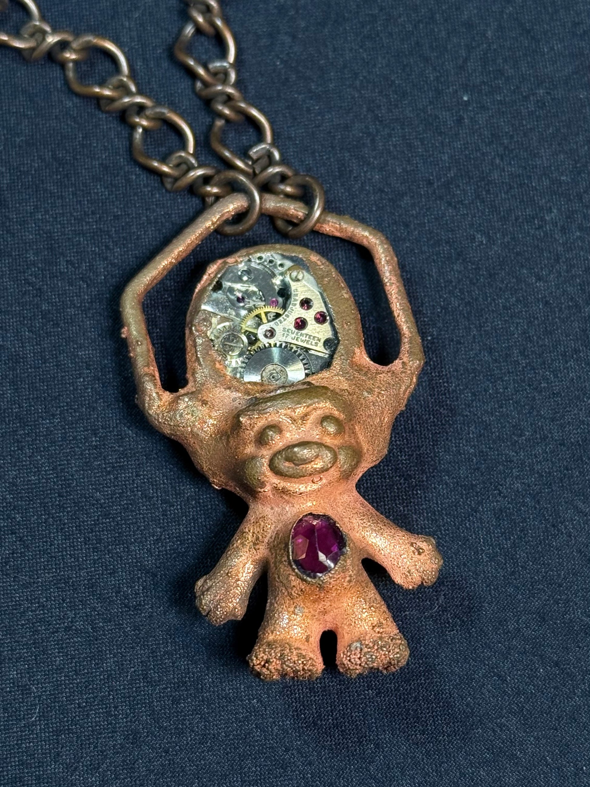 Electroform copper troll featuring old watch parts encased in resin featuring rubys and garnet.