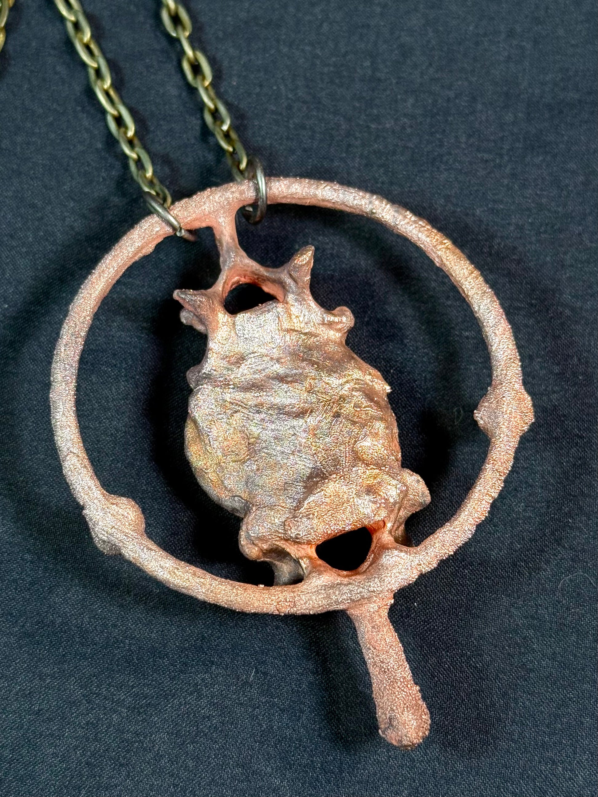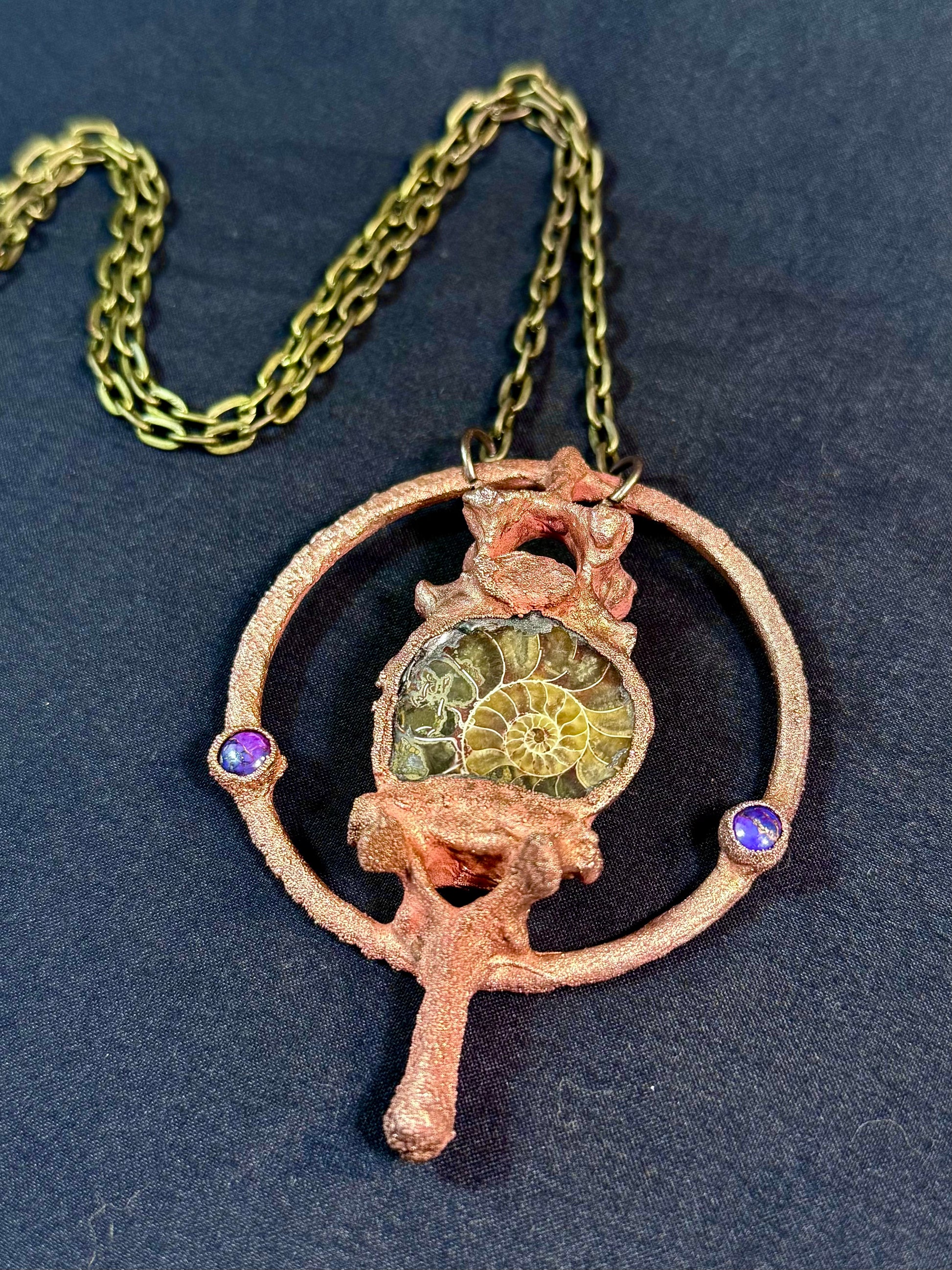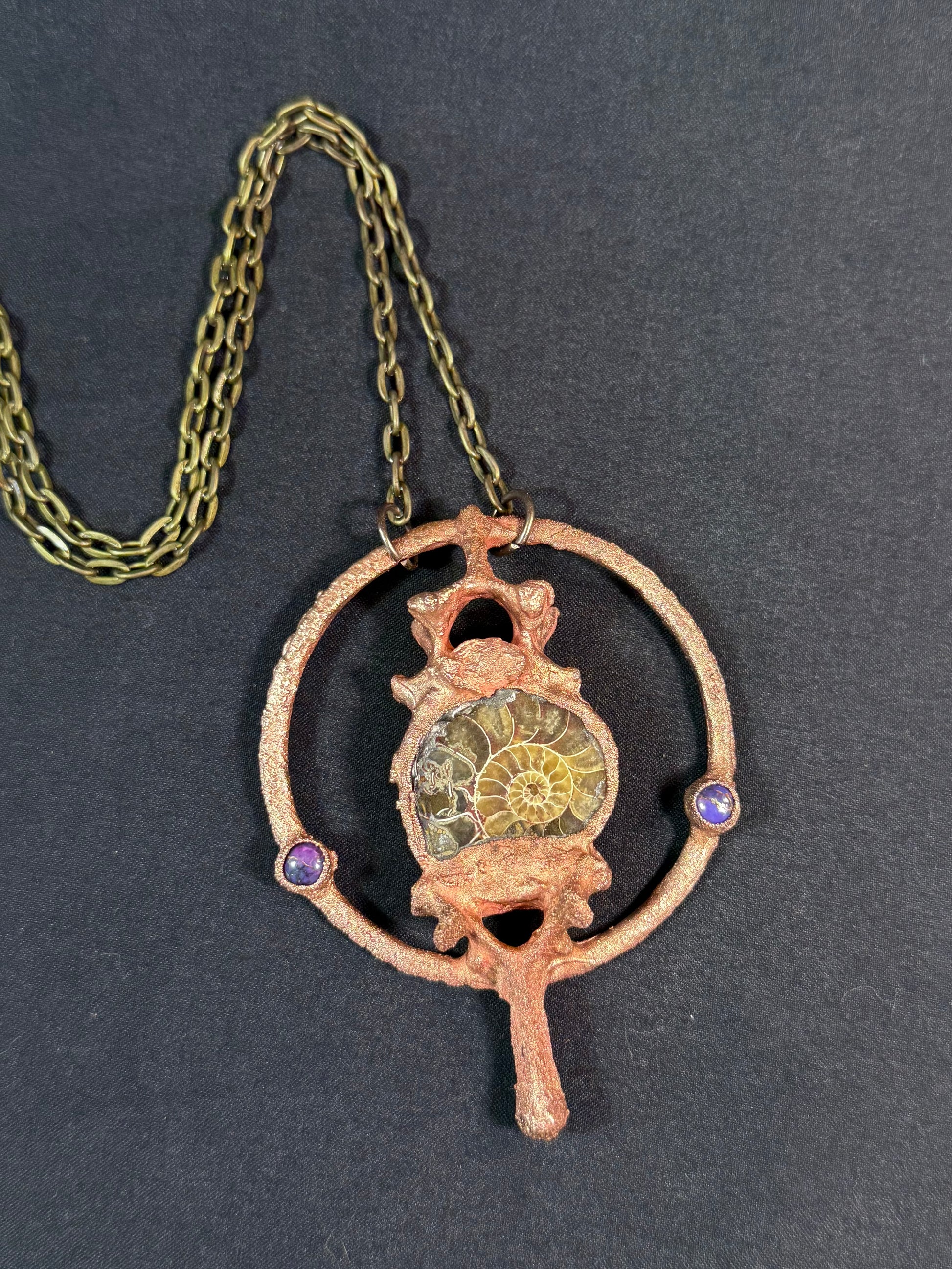 Electroform copper vertebra bones featuring ammonite and copper turquoise.