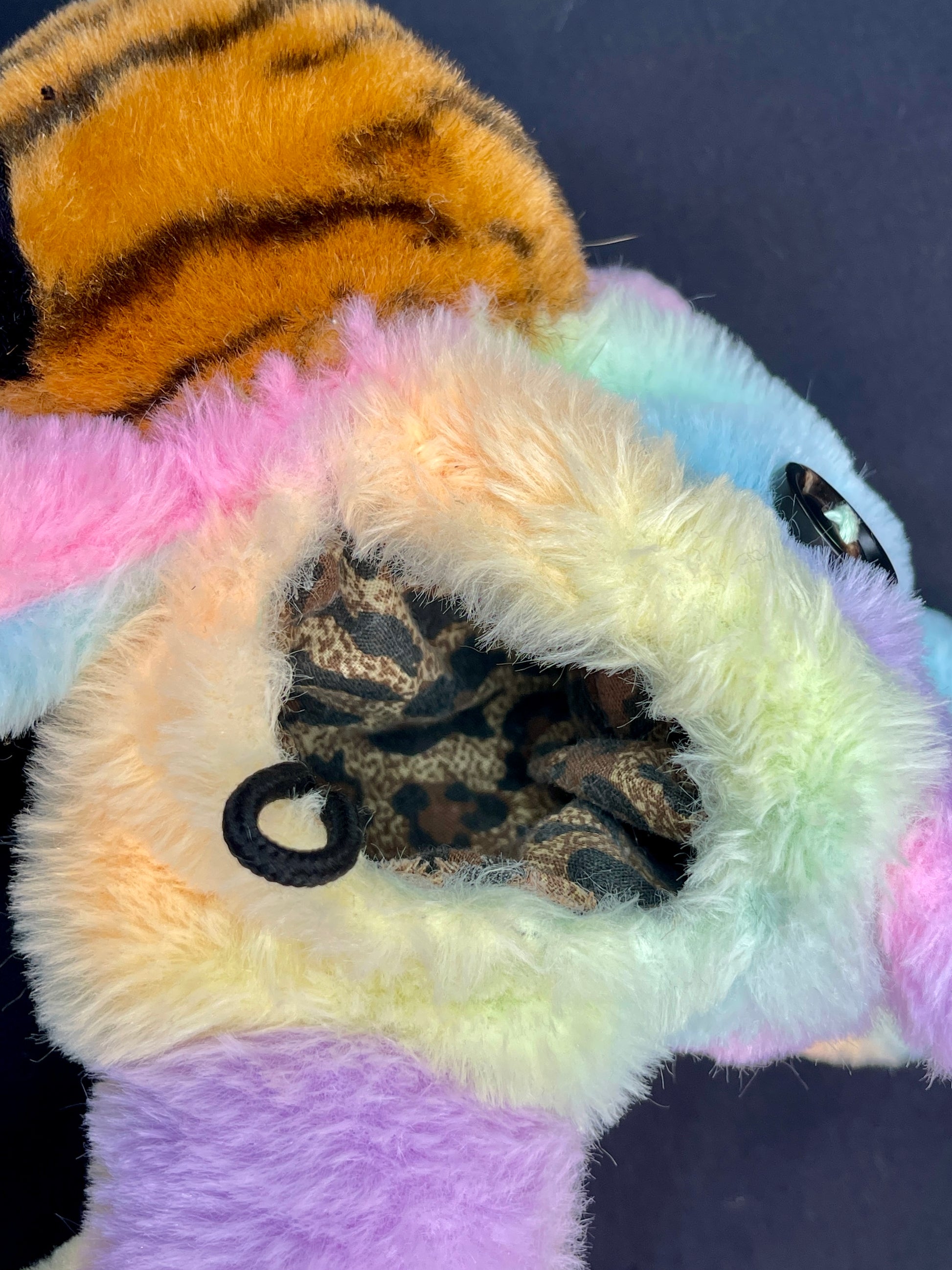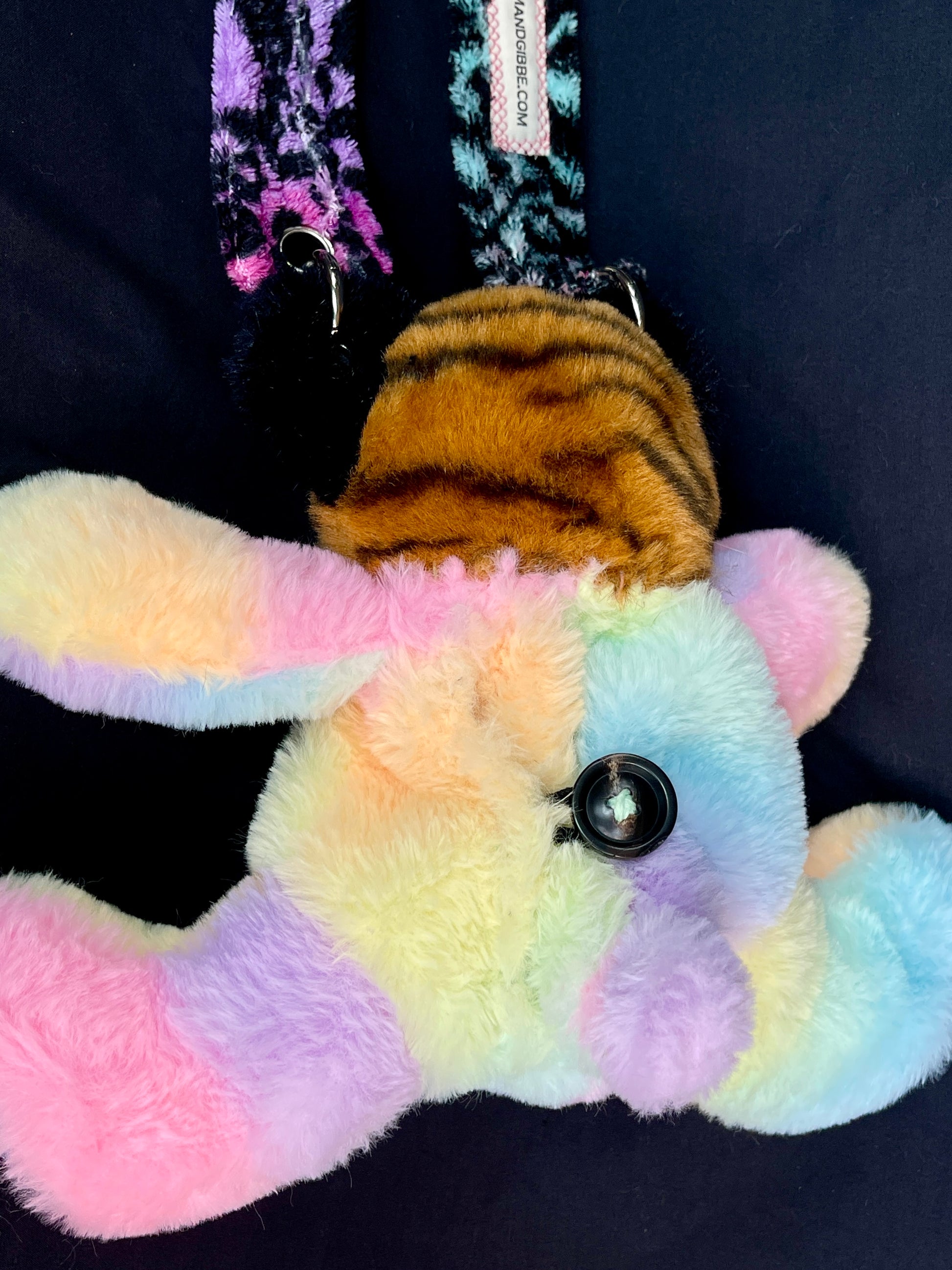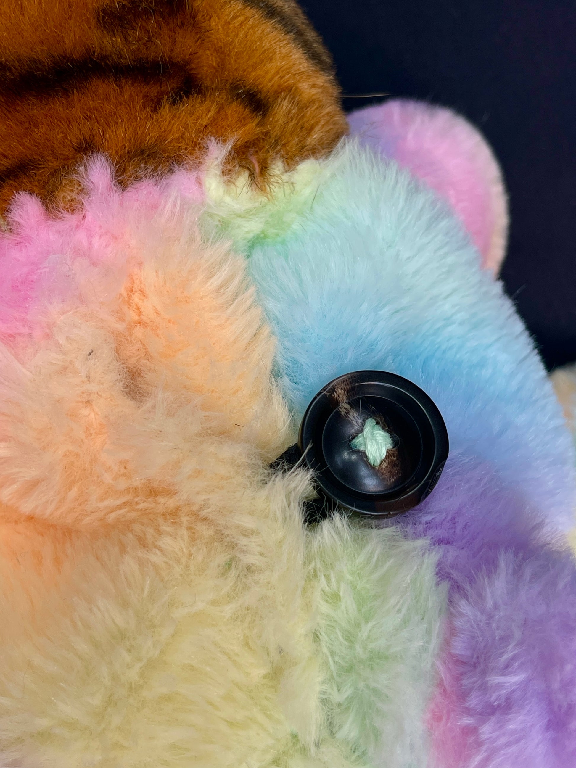 The patch is a linoleum block carving designed, carved and printed by Gibbe, hand sewn onto the stuffed animal.