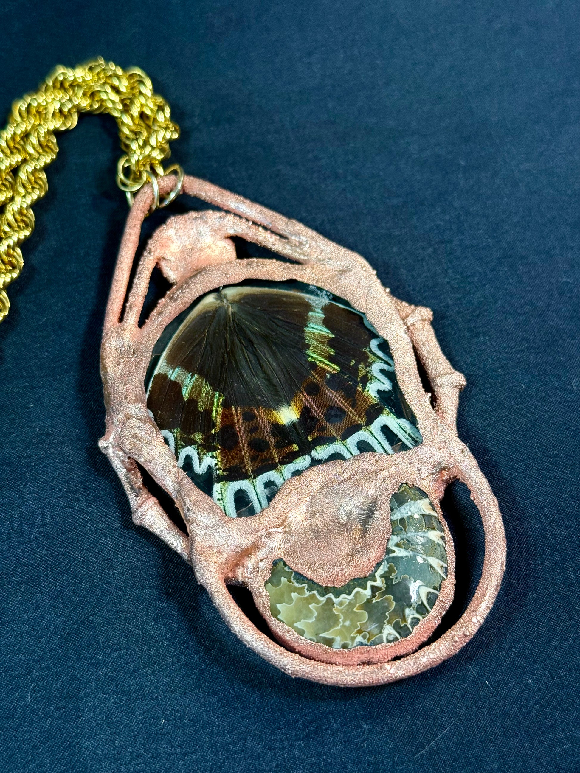 Electroform copper sunset moth encased in resin by the amazing @eclectic_collectics (on Instagram) featuring amethyst, labradorite, blue kyanite, welo opal, and ammonite.