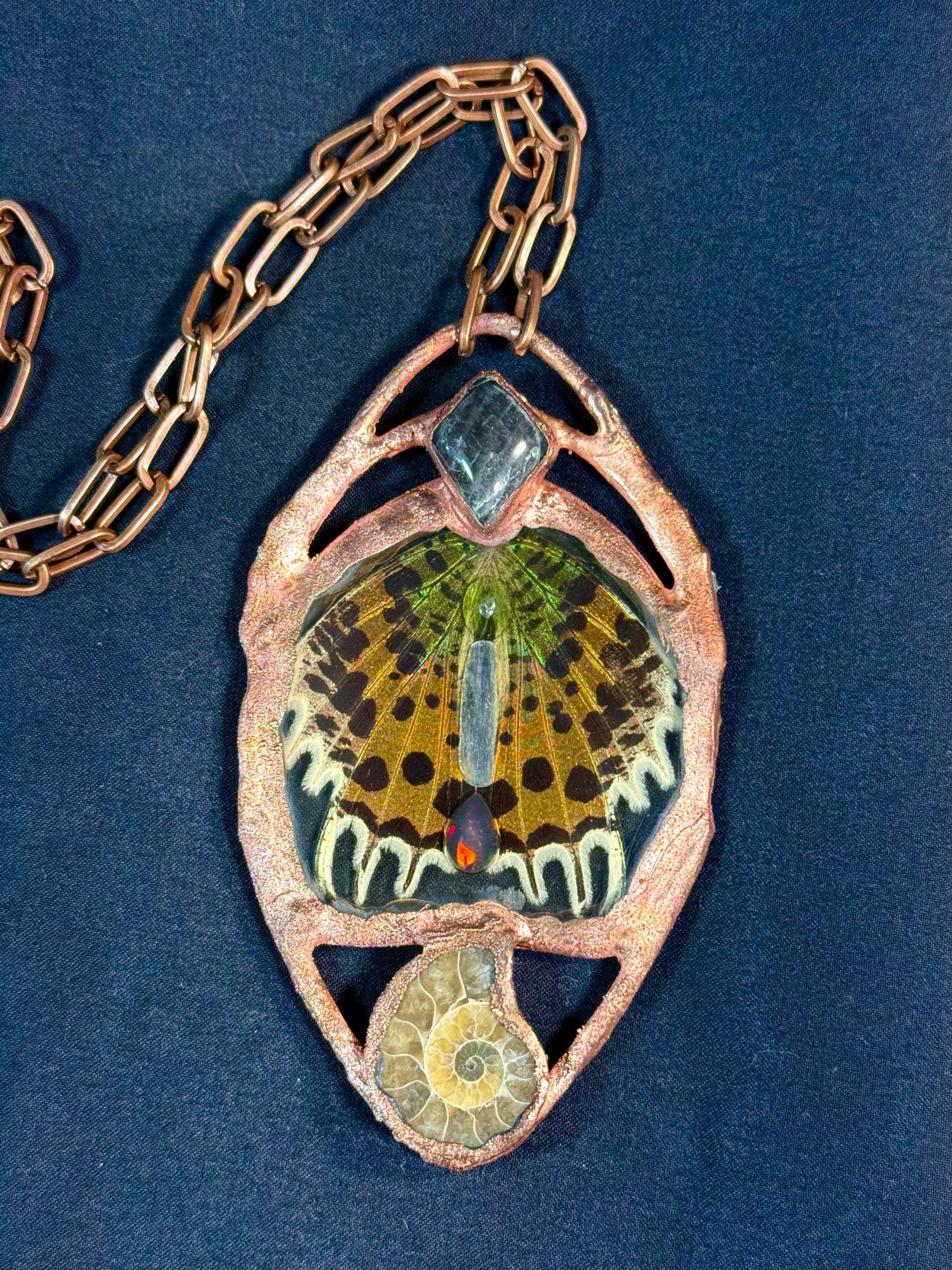 Electroform copper sunset moth encased in resin by the amazing @eclectic_collectics (on Instagram) featuring labradorite, smoked opal, peridot, blue kyanite, and ammonite.