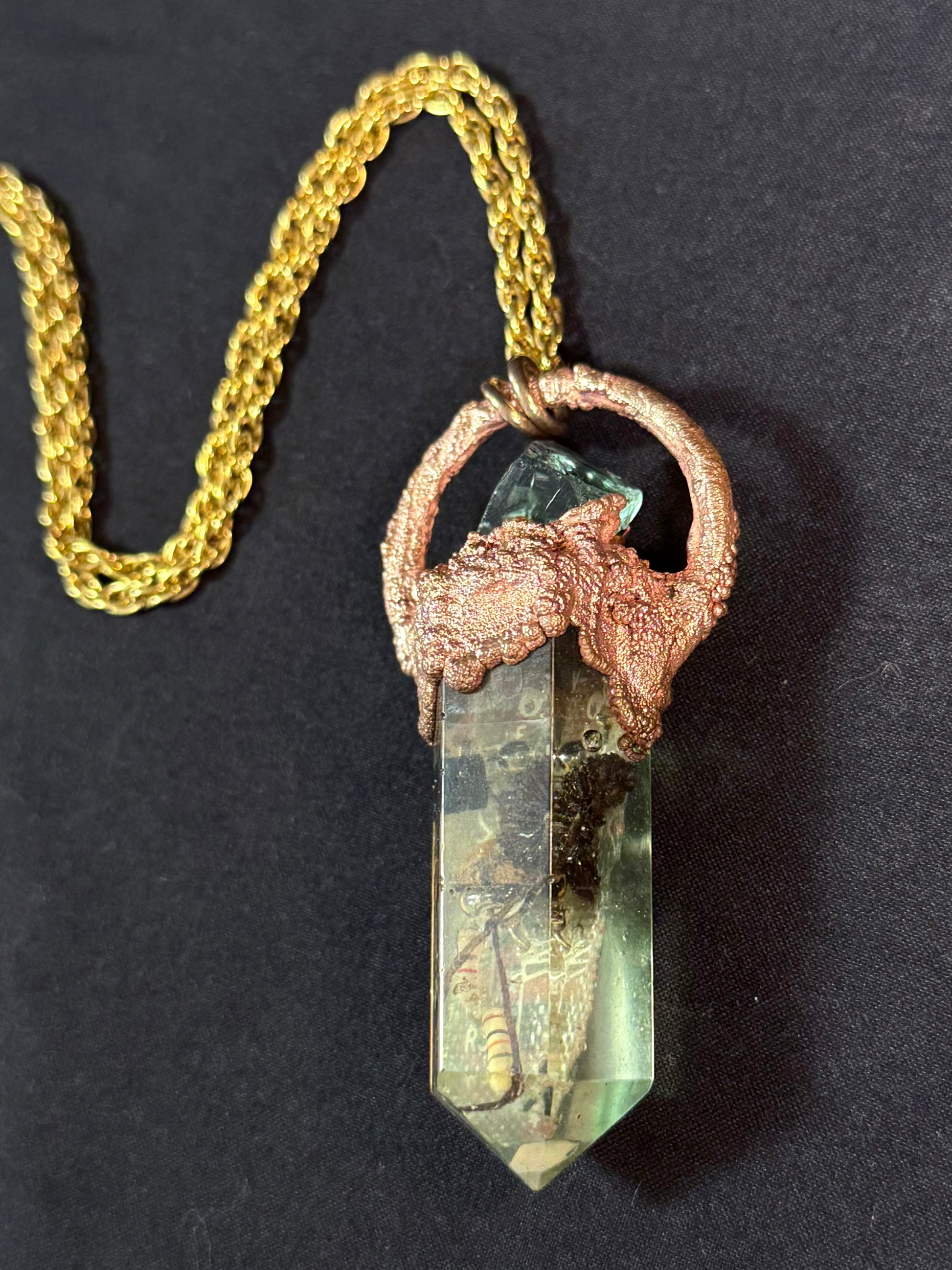 Electroform copper resin crystal encasing mushrooms, opal and a computer chip with a fluorite cube on top.
