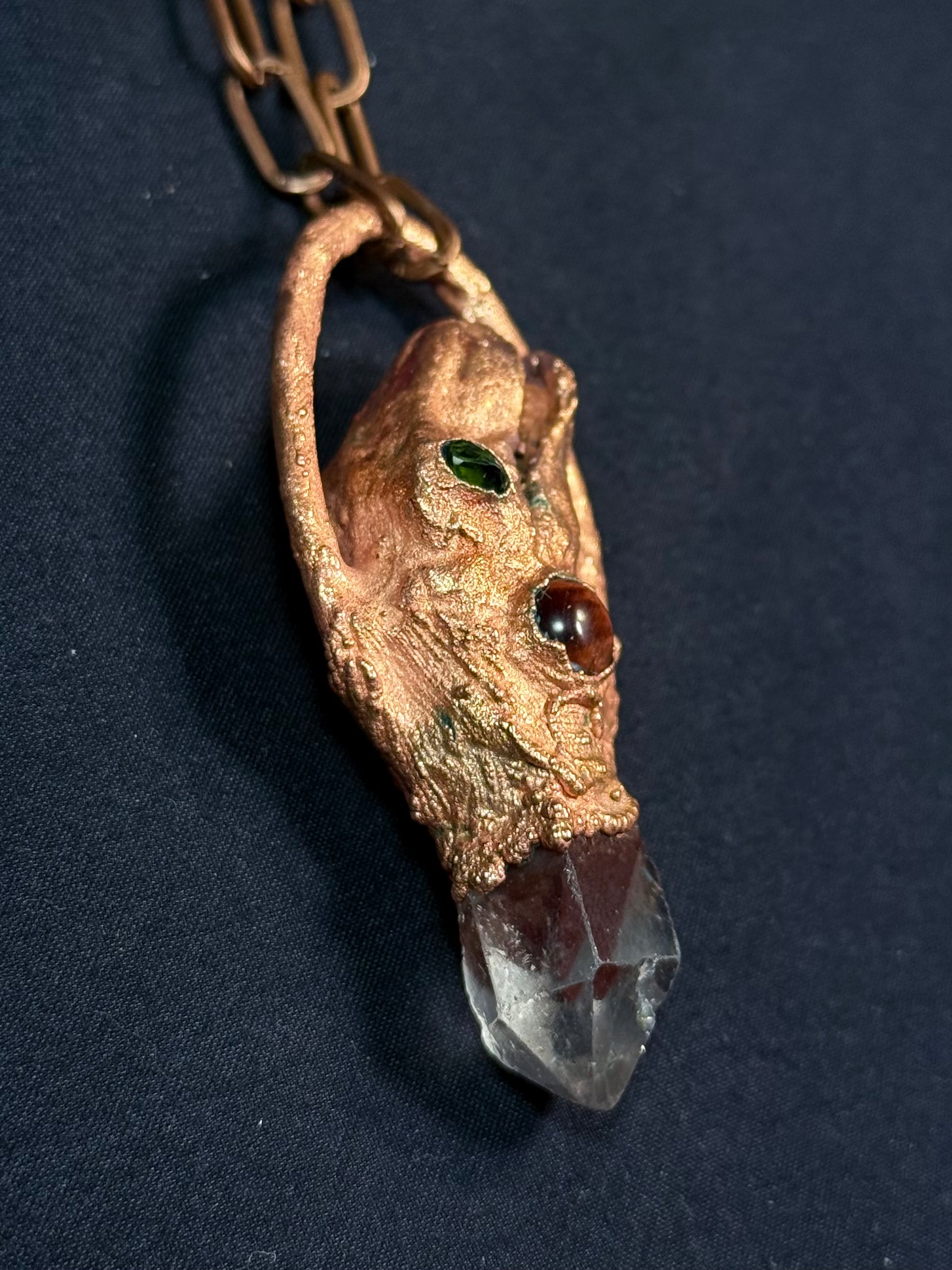 Electroform copper toy T-Rex head featuring a phantom quartz point, tigers eye, and moldavite.