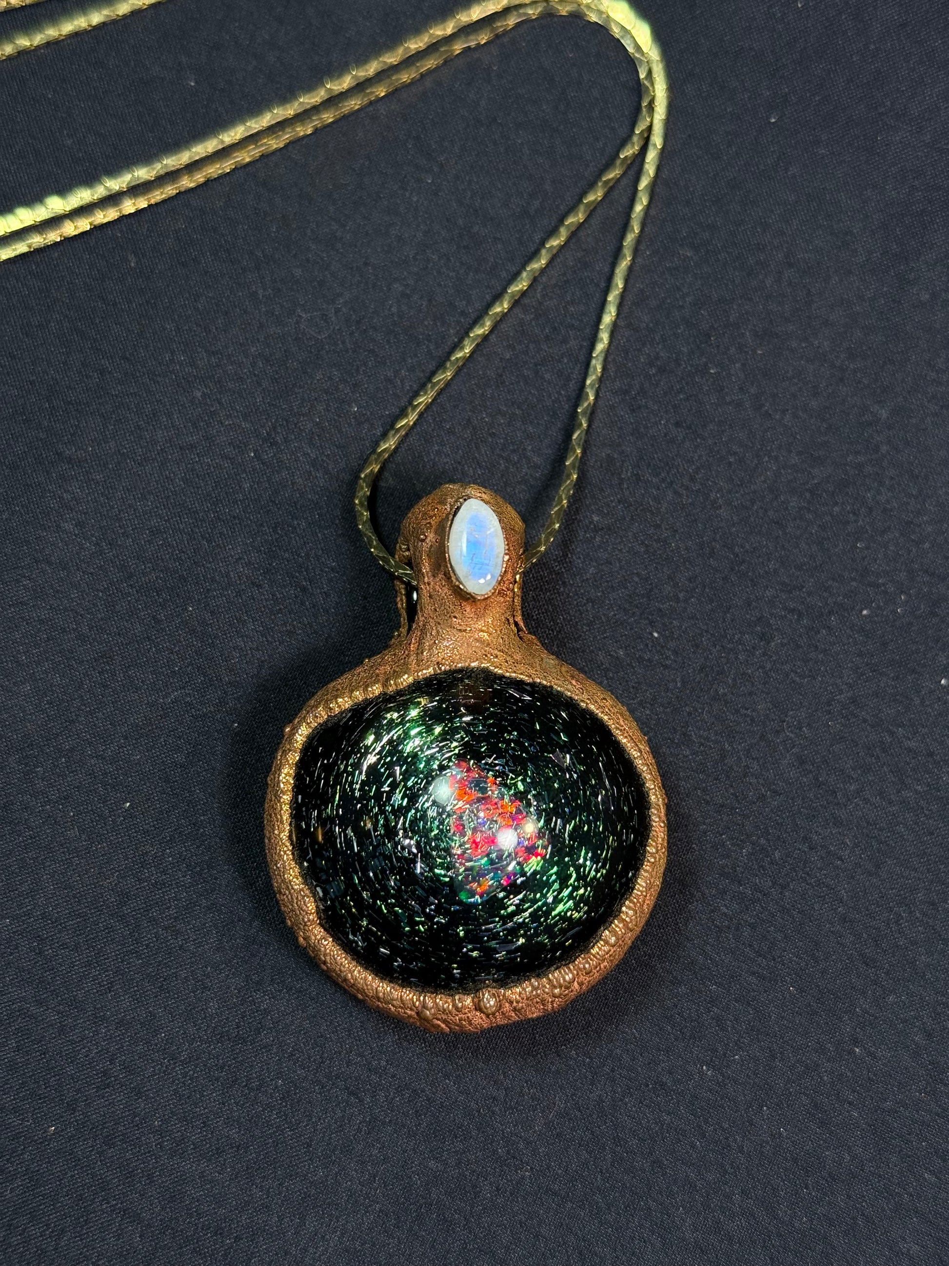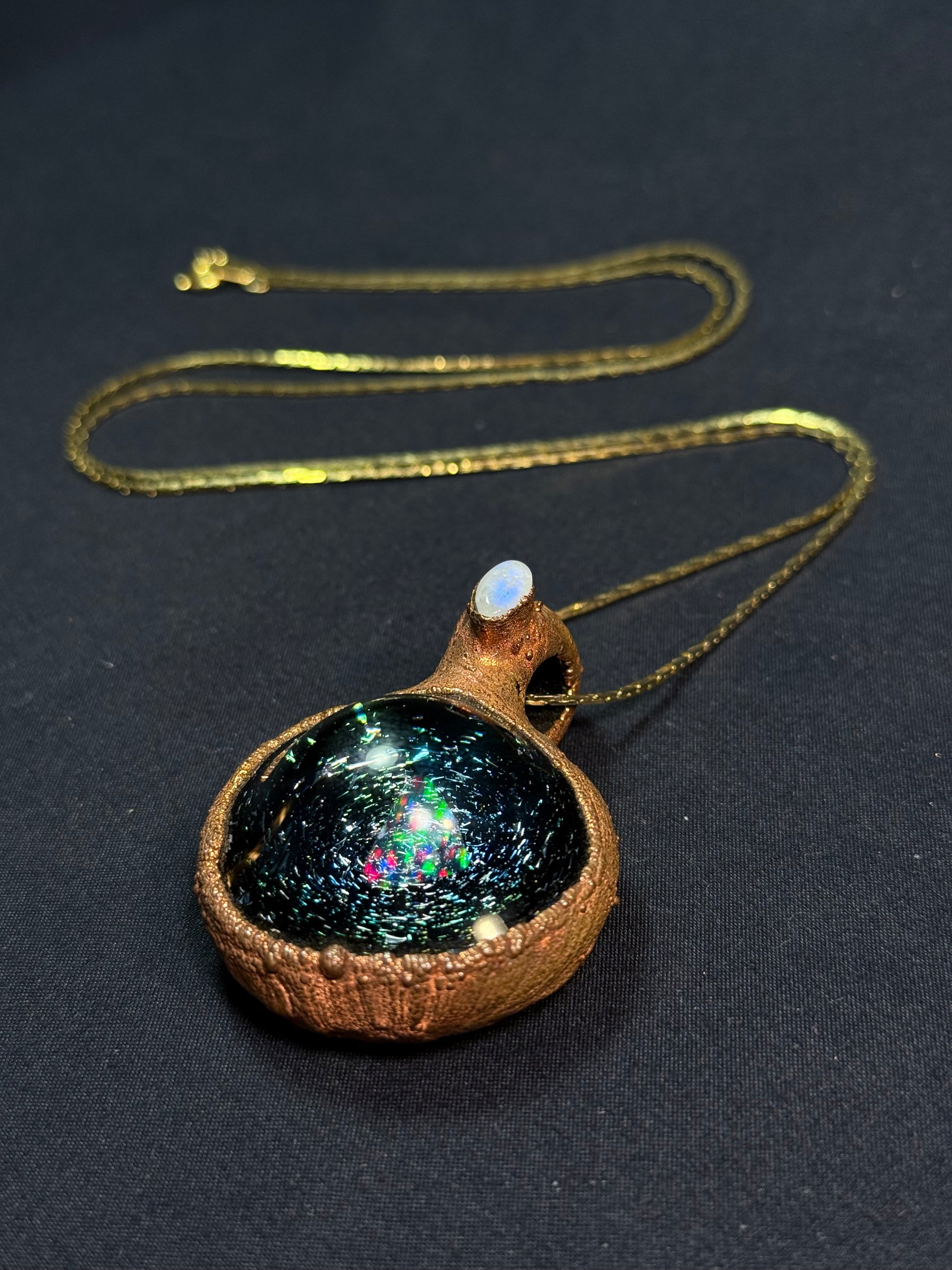Electroform copper glass rainbow galaxy by Erin Cartee (@theglassportalstudio) featuring opal and moonstone.