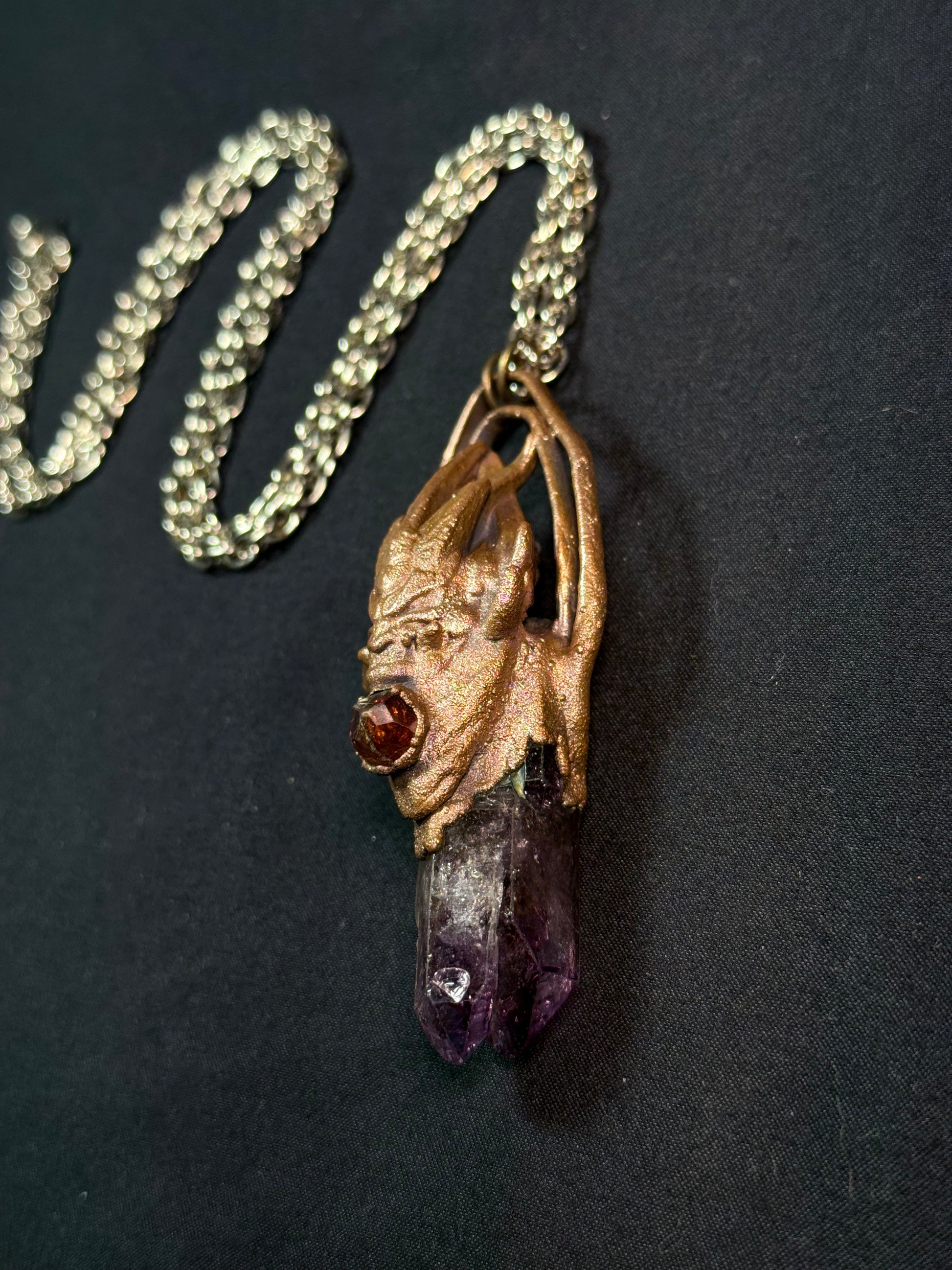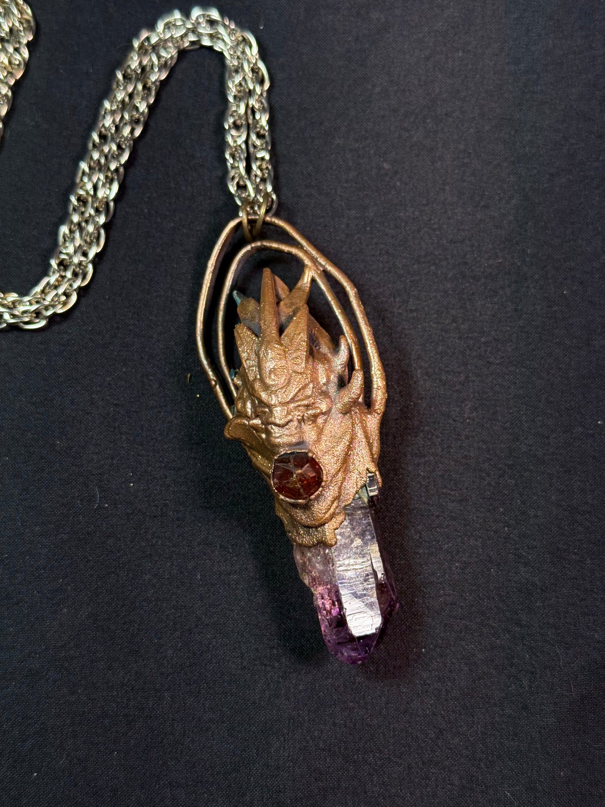 Electroform copper warrior featuring amethyst point, citrine and carnelian.