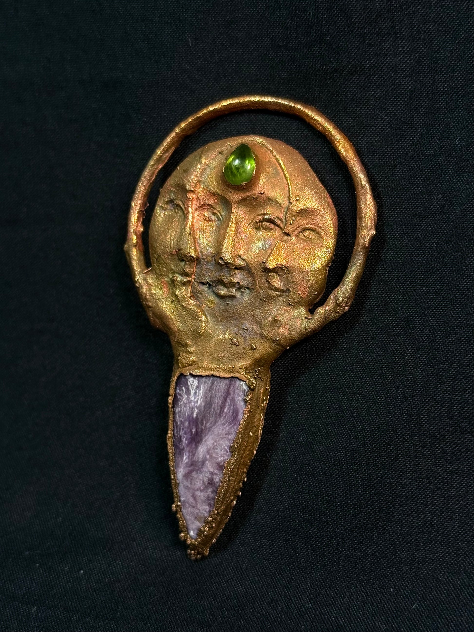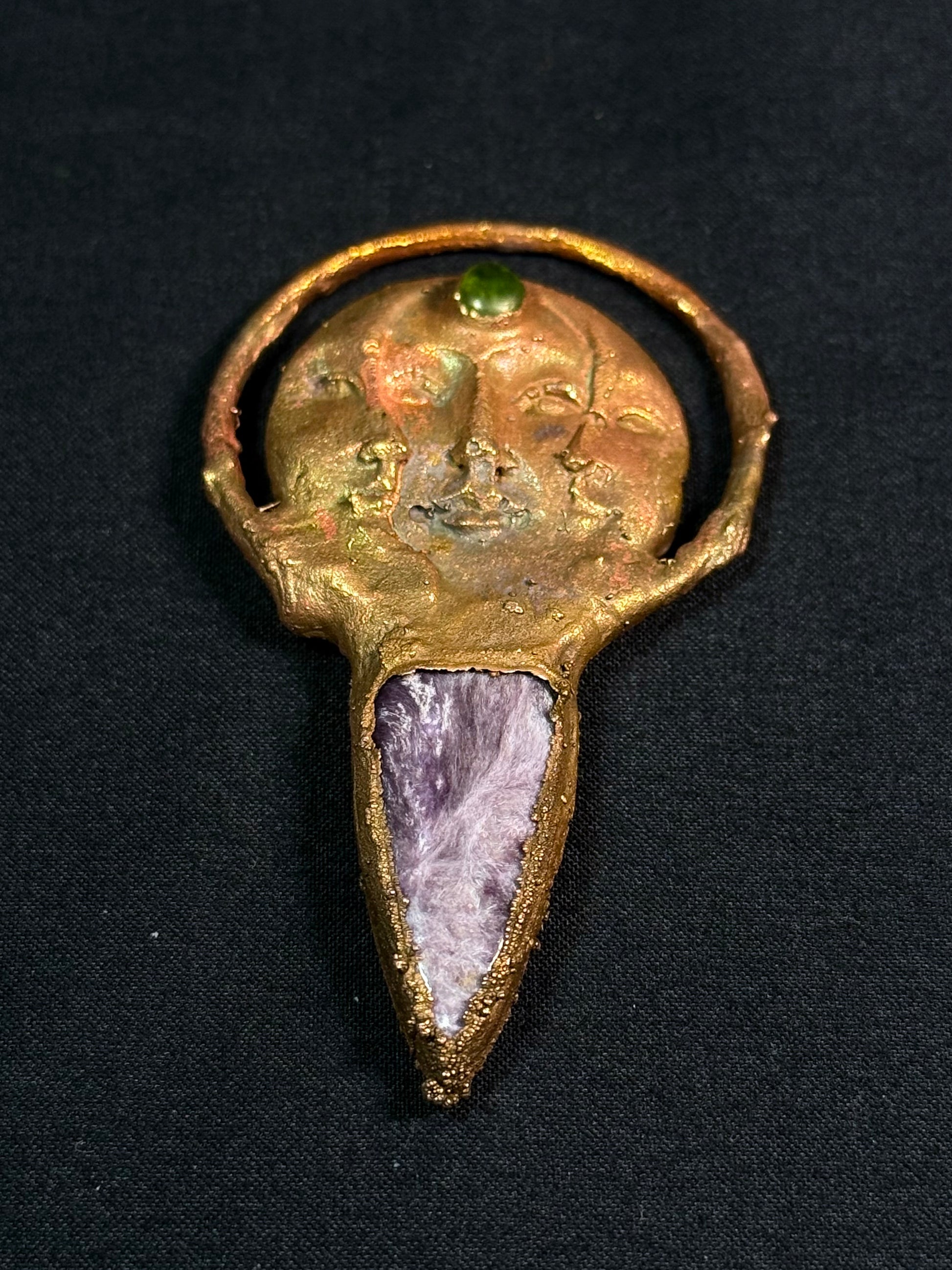 Electroform copper sun and moon pendant featuring charoite and peridot.