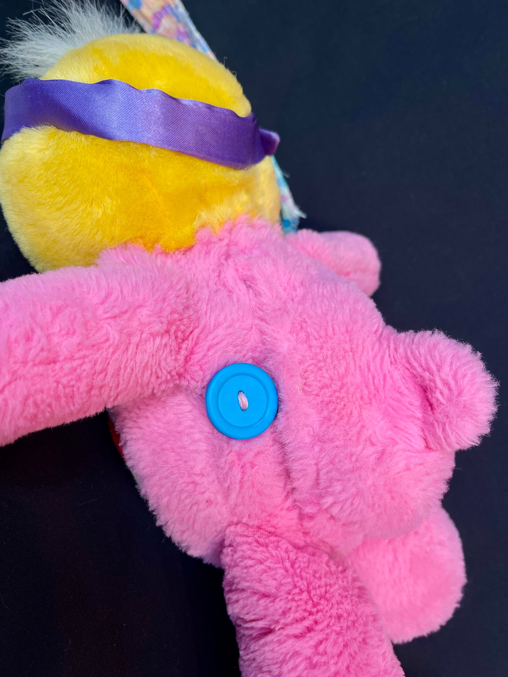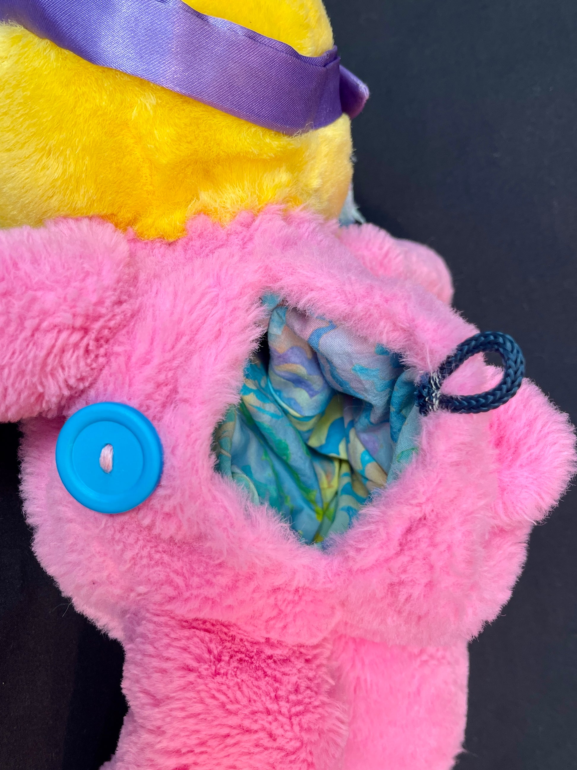 Stuffed animal bag made from all thrifted materials.