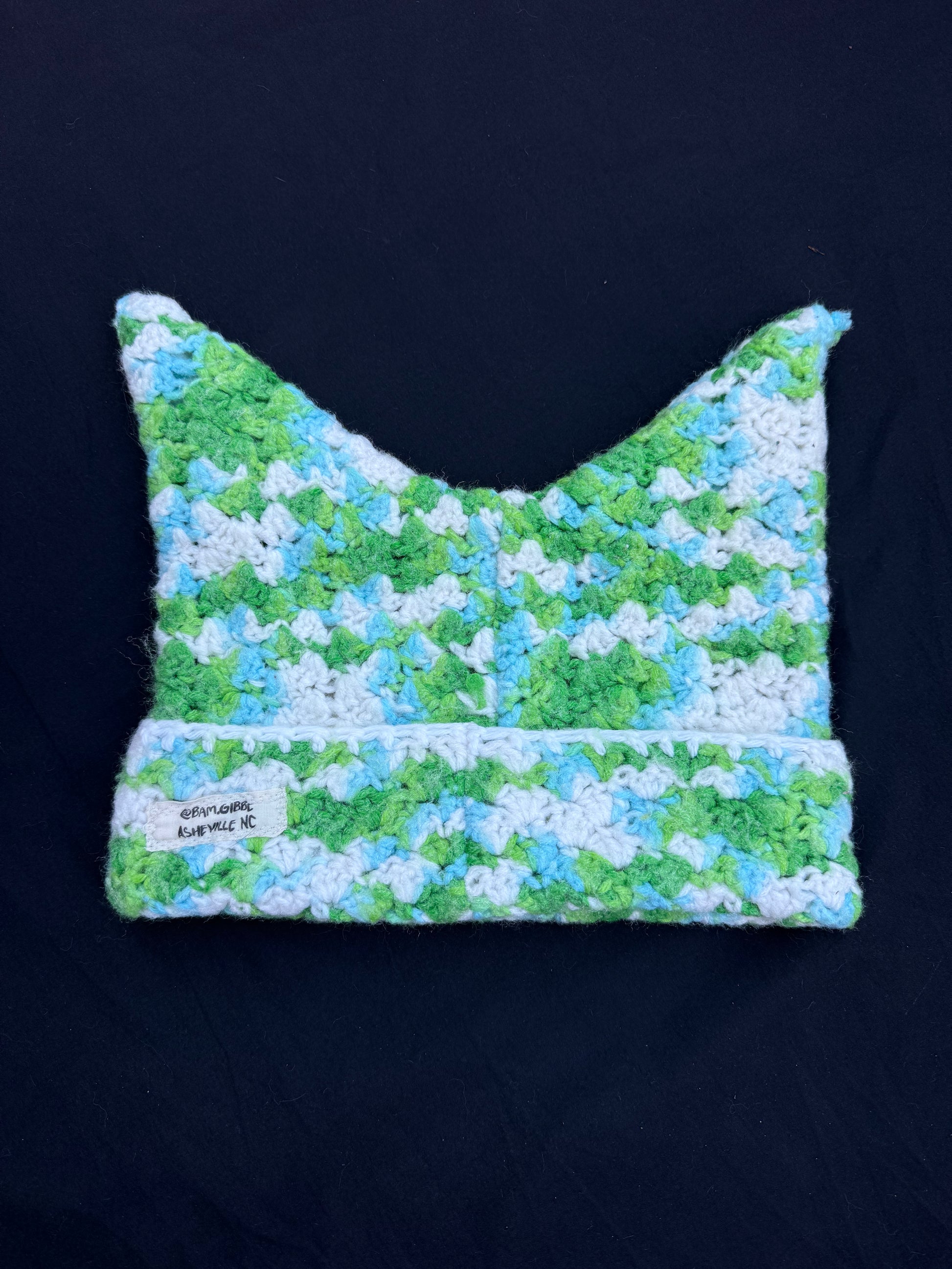 Upcycled crochet hat created from a thrifted crochet blanket.