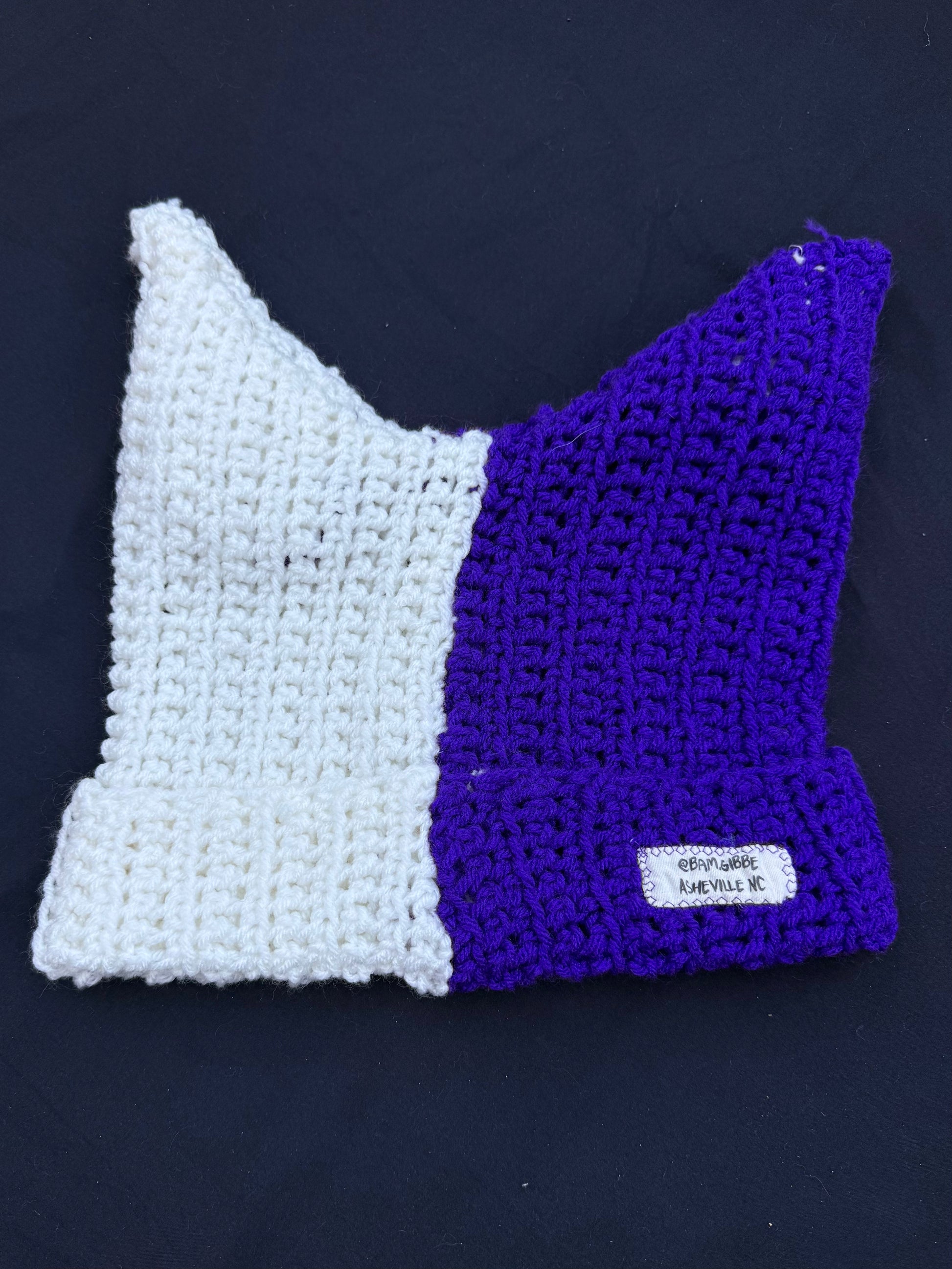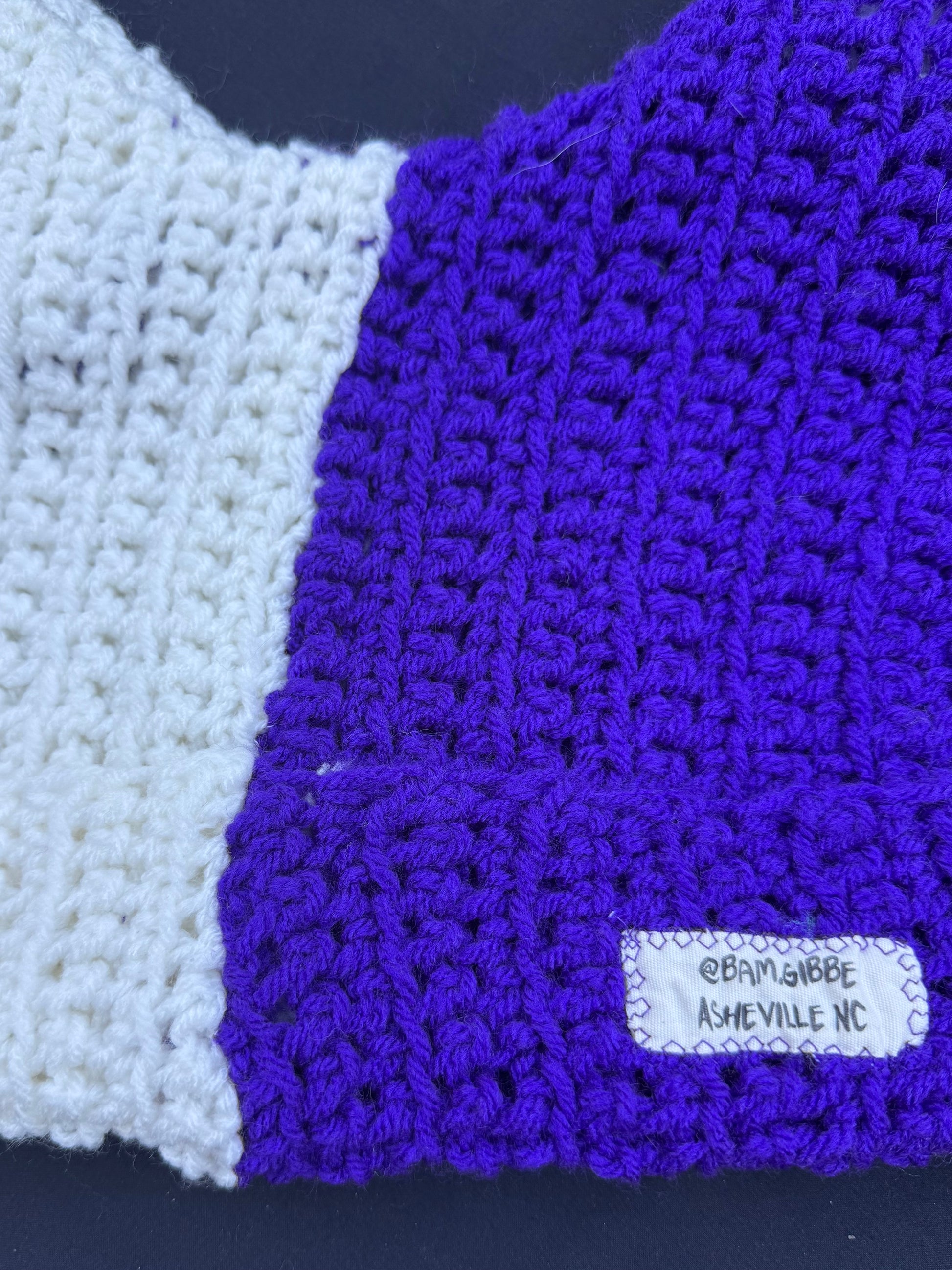 Upcycled crochet hat created from a thrifted crochet blanket.