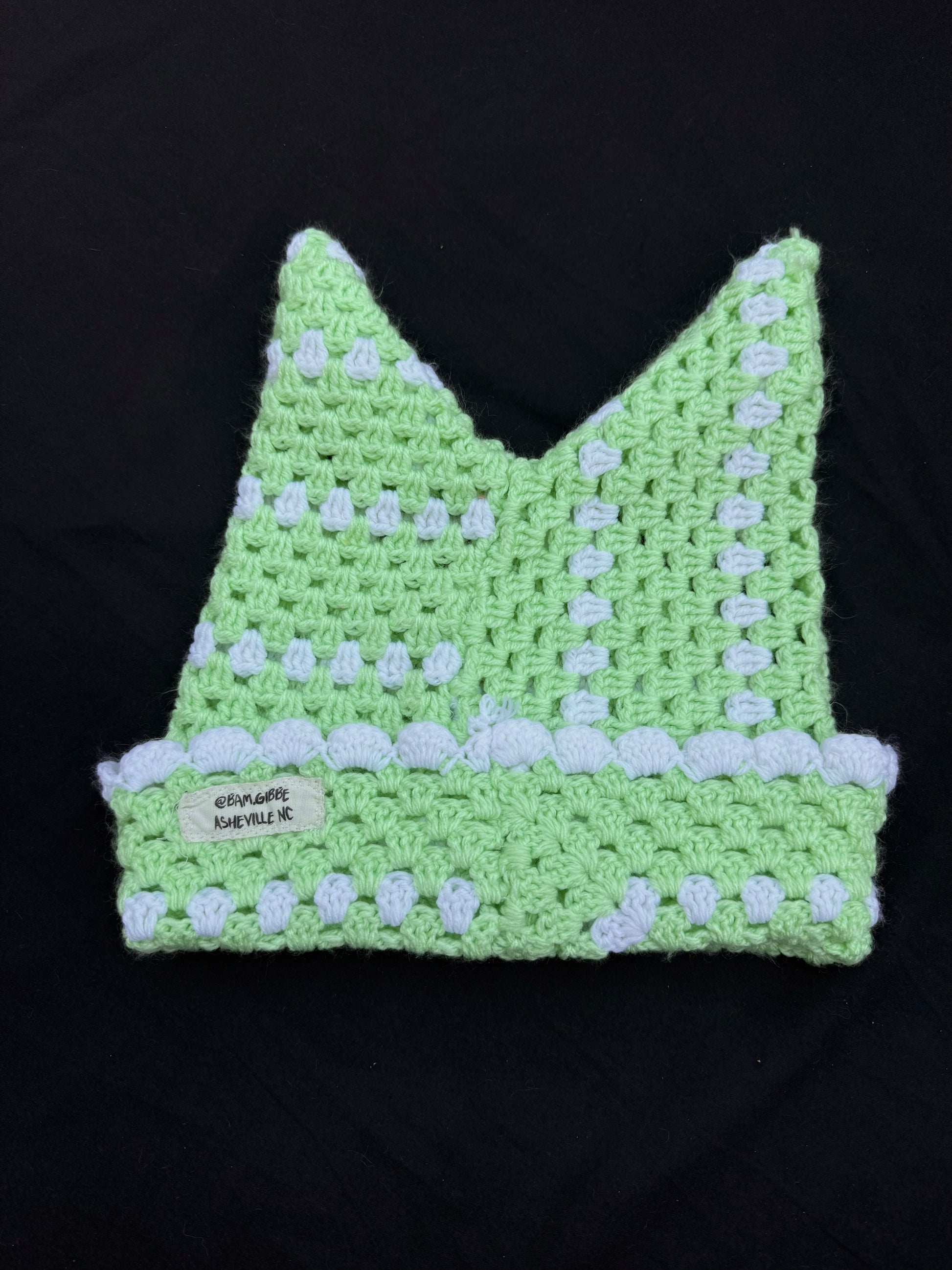 Upcycled crochet hat created from a thrifted crochet blanket.