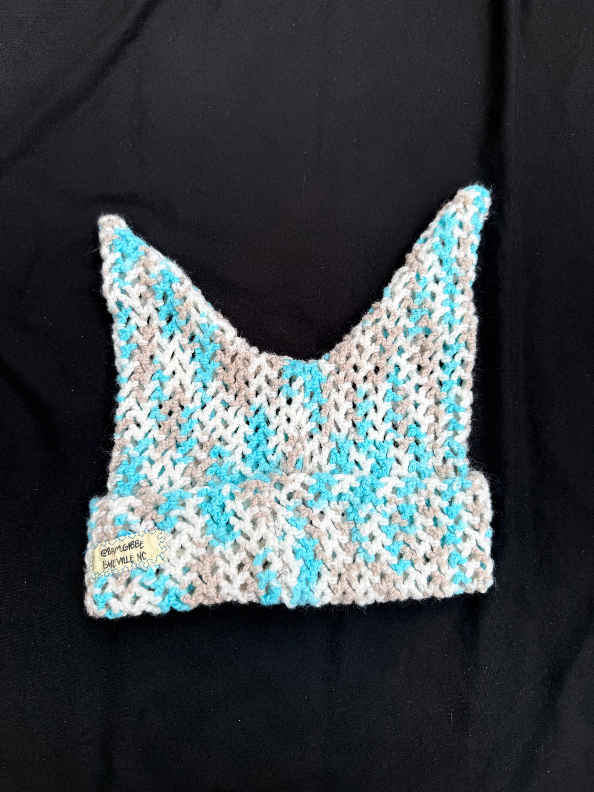 Upcycled crochet hat created from a thrifted crochet blanket.