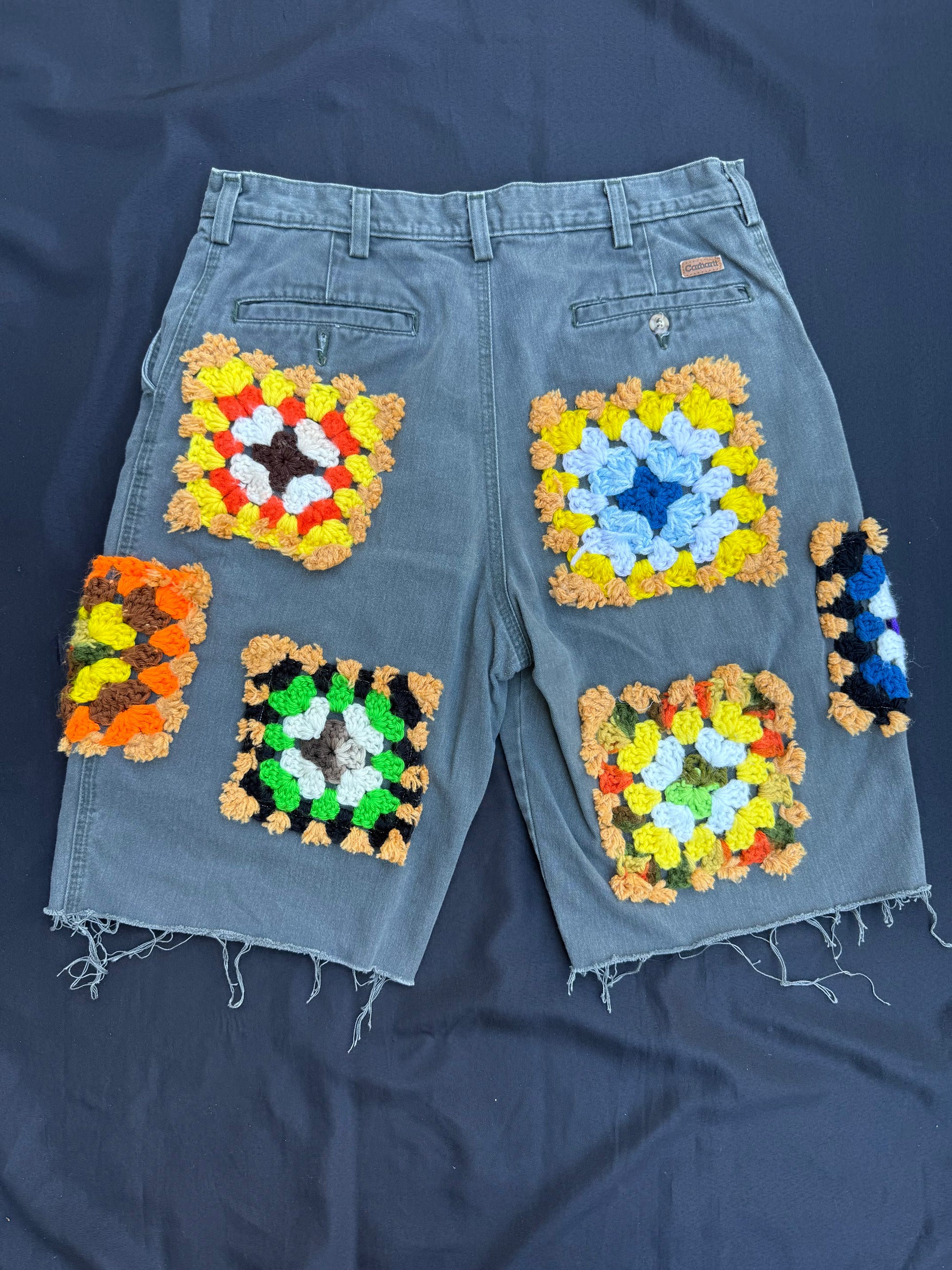 Granny squares cut out from a thrifted crochet blanket and sewn onto shorts.