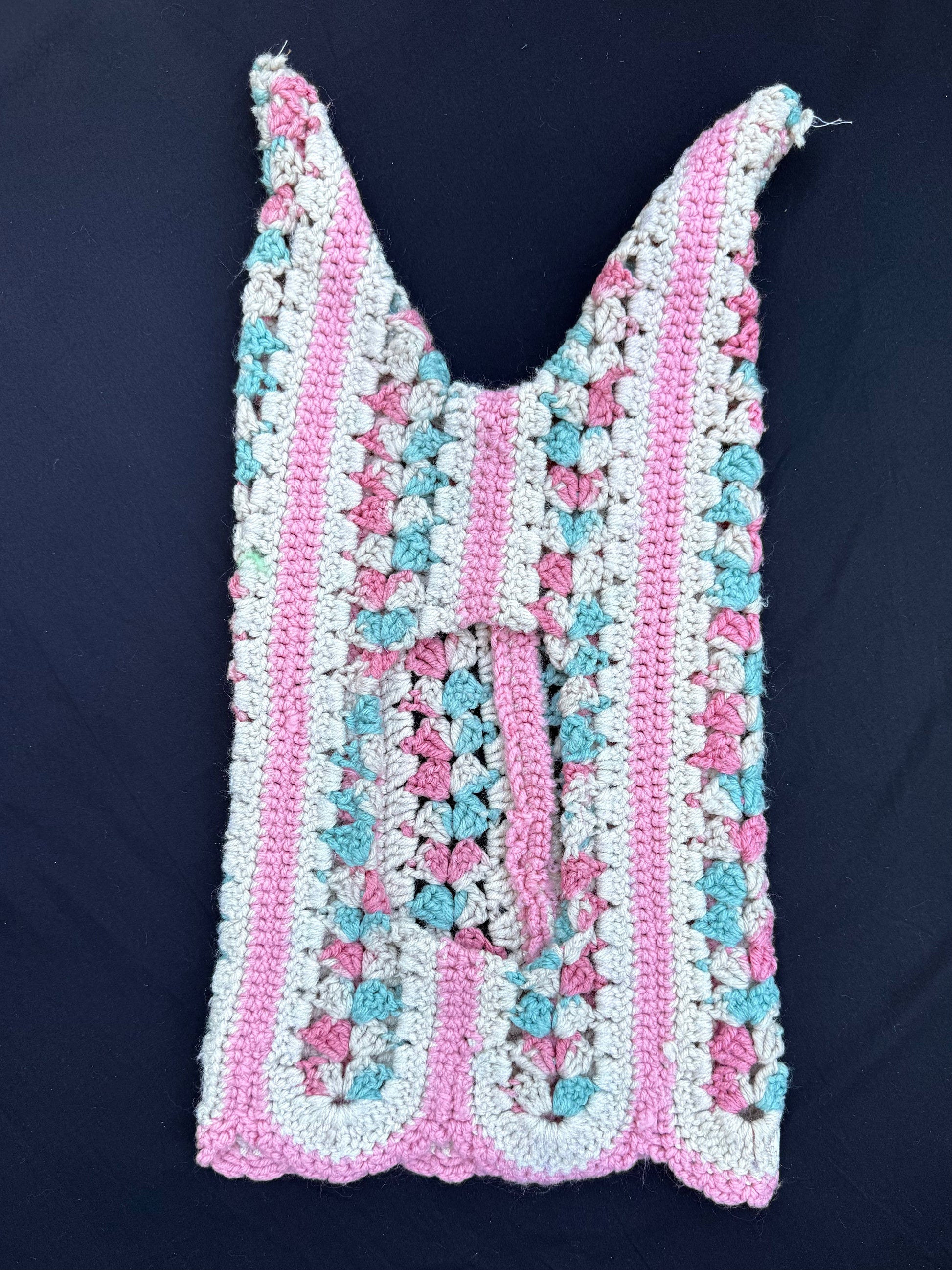 Upcycled crochet mask created from a thrifted crochet blanket.