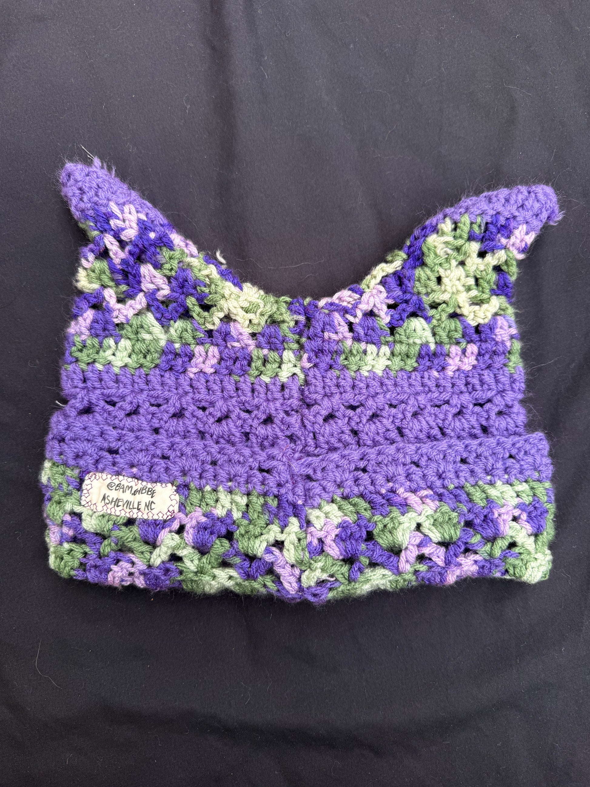 Upcycled crochet hat created from a thrifted crochet blanket.
