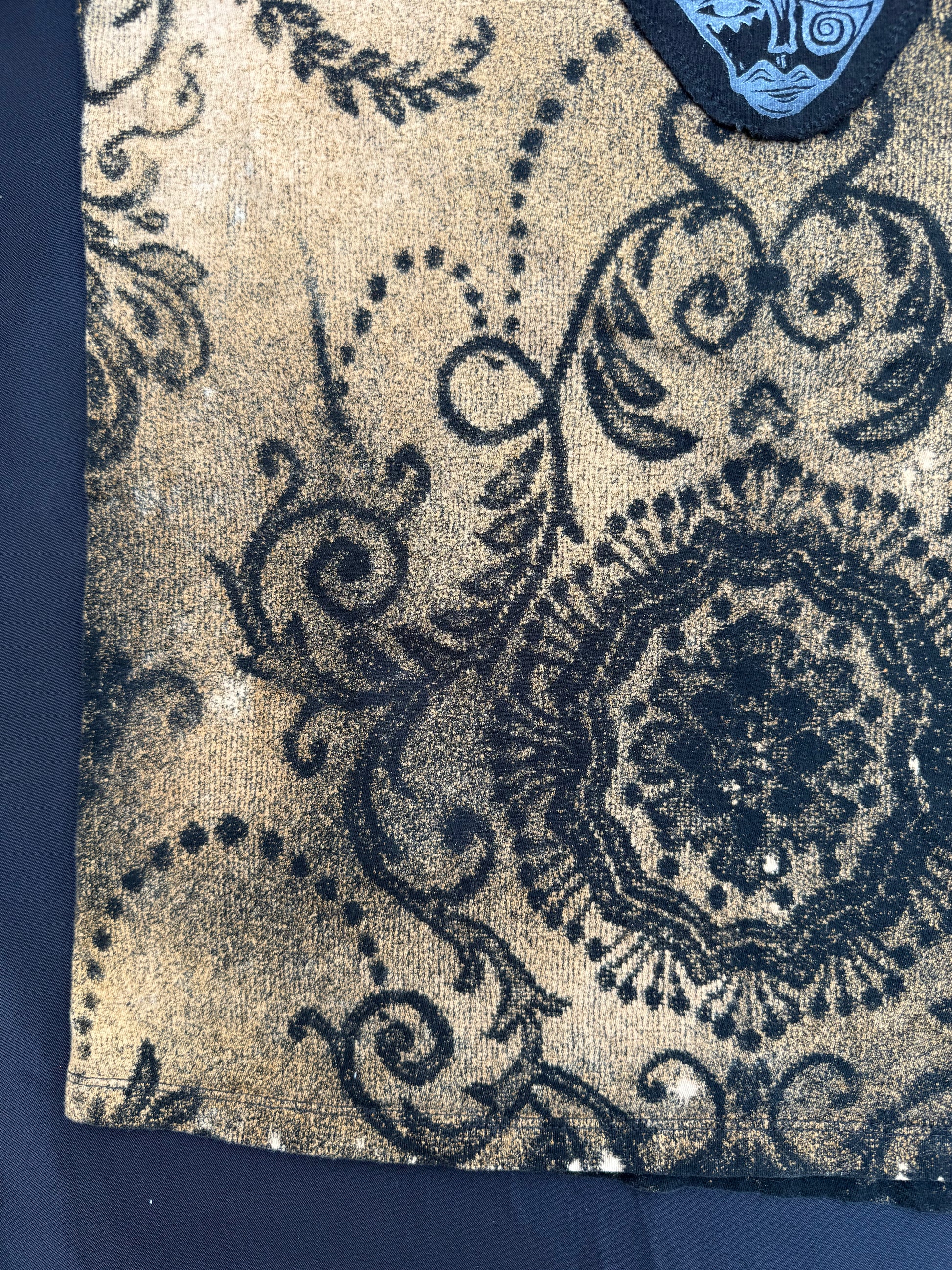 Sewn onto t-shirt bleach dyed with vintage lace by Bam.