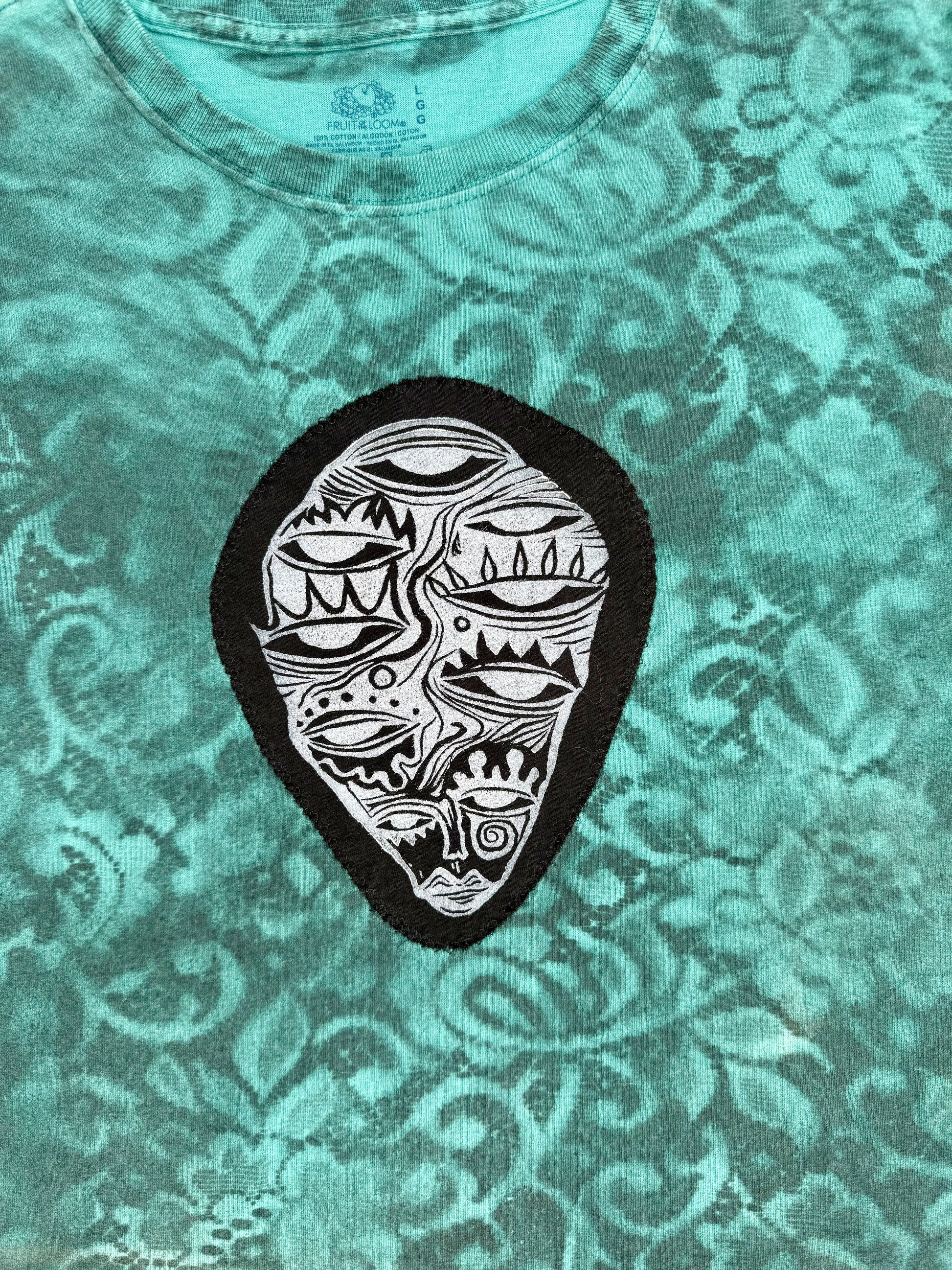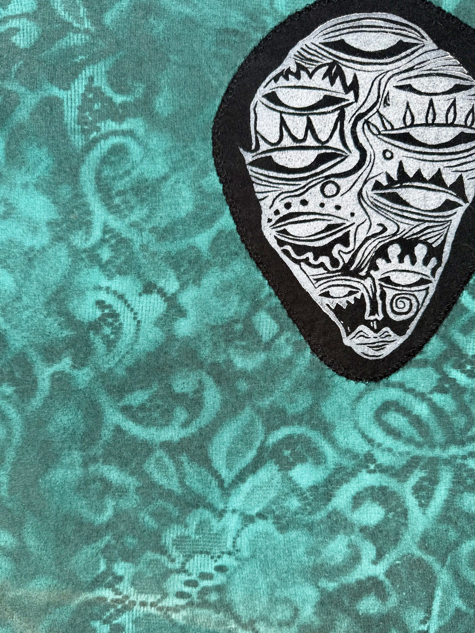Linoleum block printed face designed, carved and printed by Gibbe.