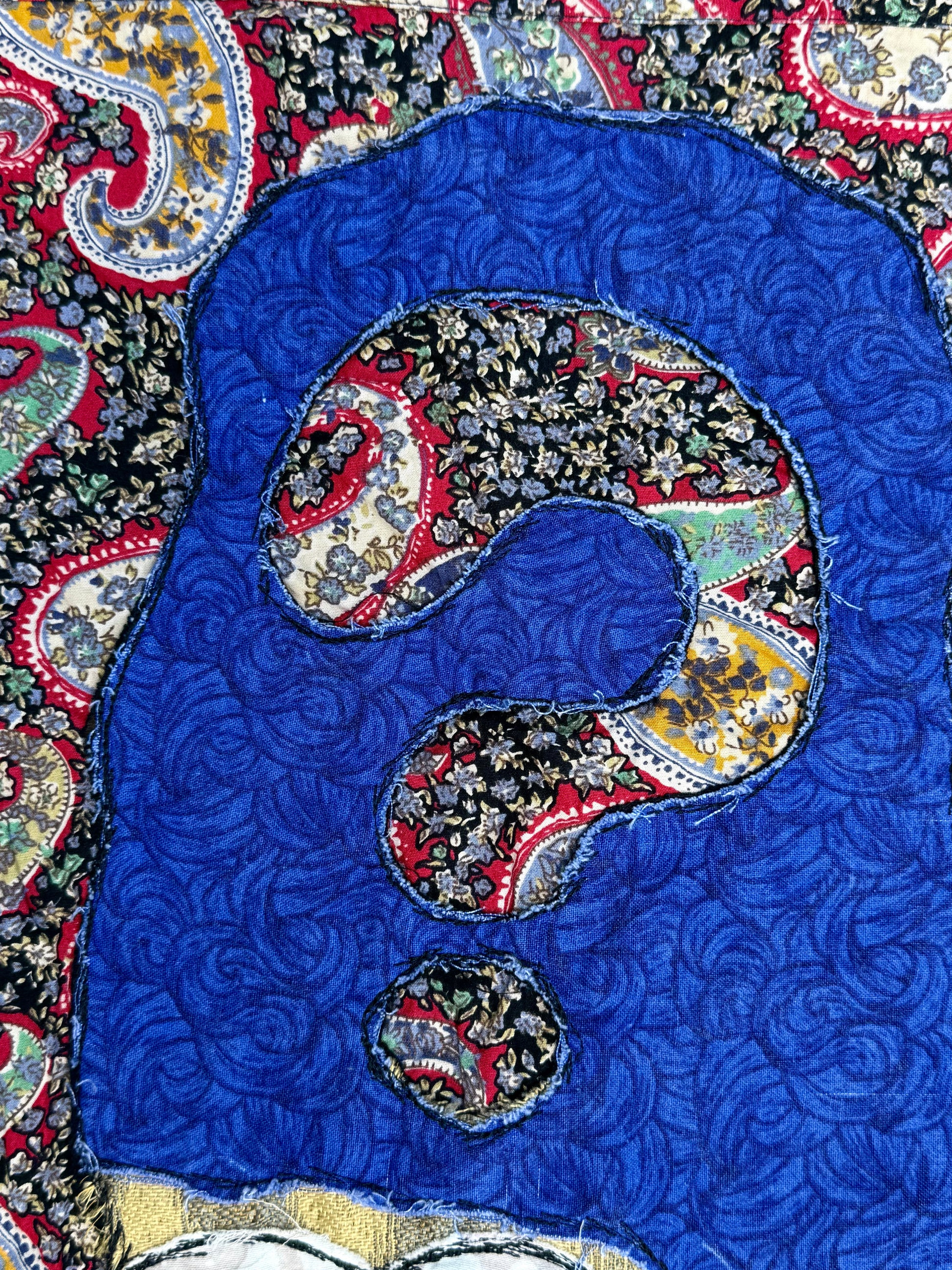 Marge Simpson patch with cut out question mark created by Bam using scrap fabrics.
