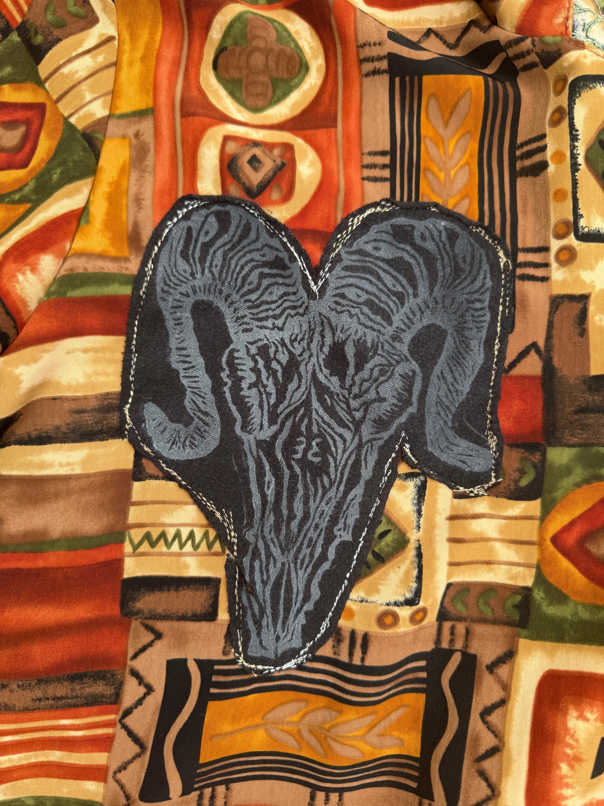 The all seeing billy goat skull is a linoleum block printed patch designed, carved and printed by Gibbe.