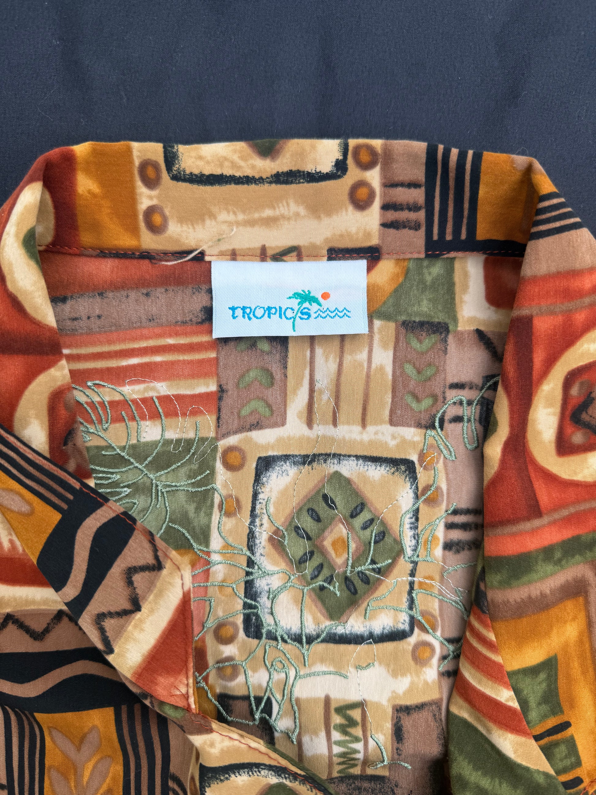All letters are cut out from different thrifted shirts and sewn onto the shirt.