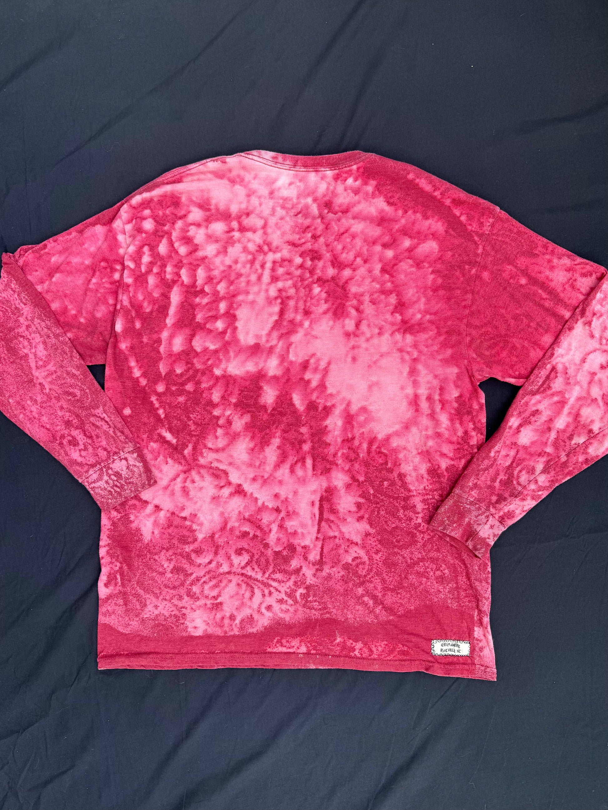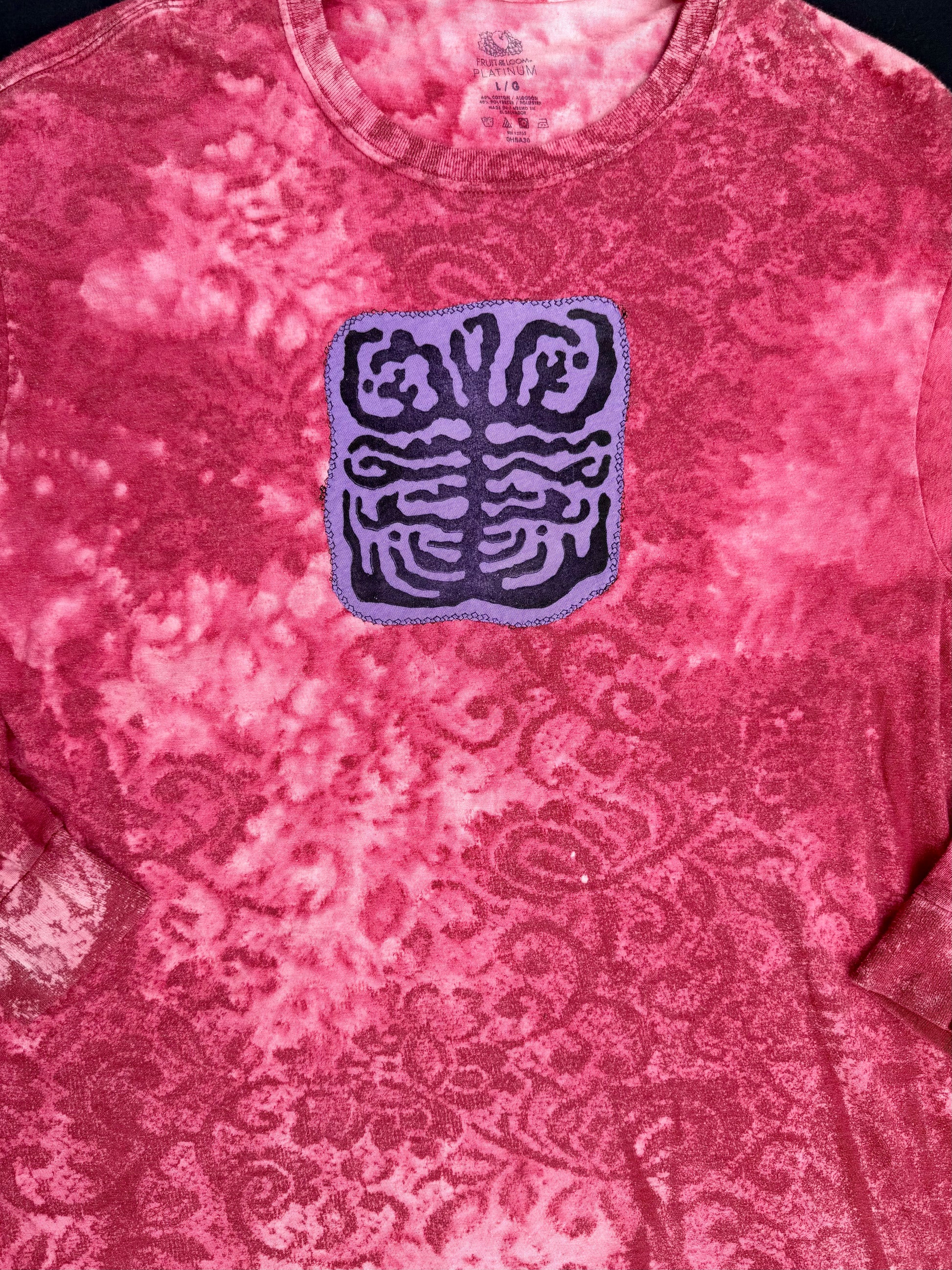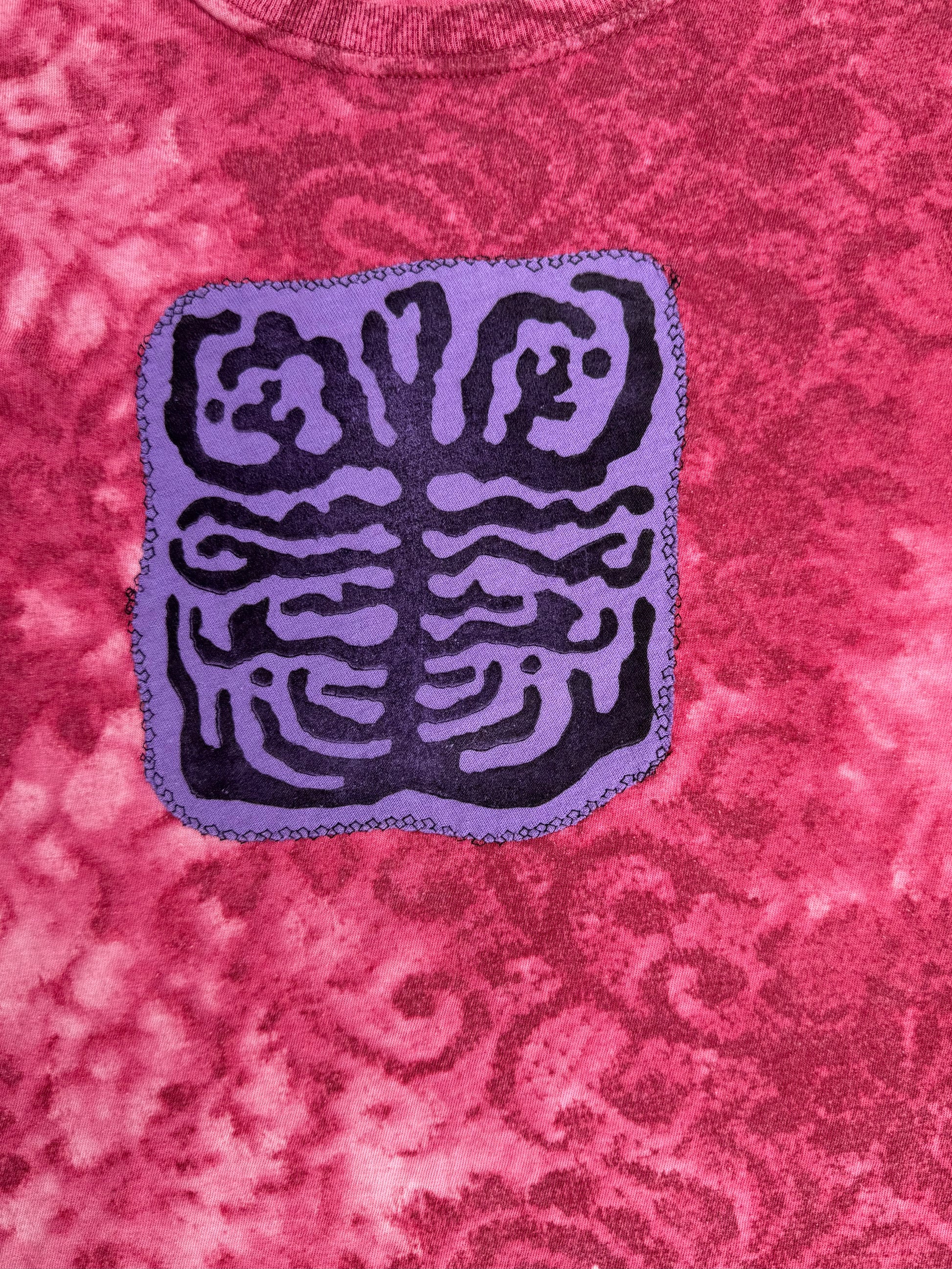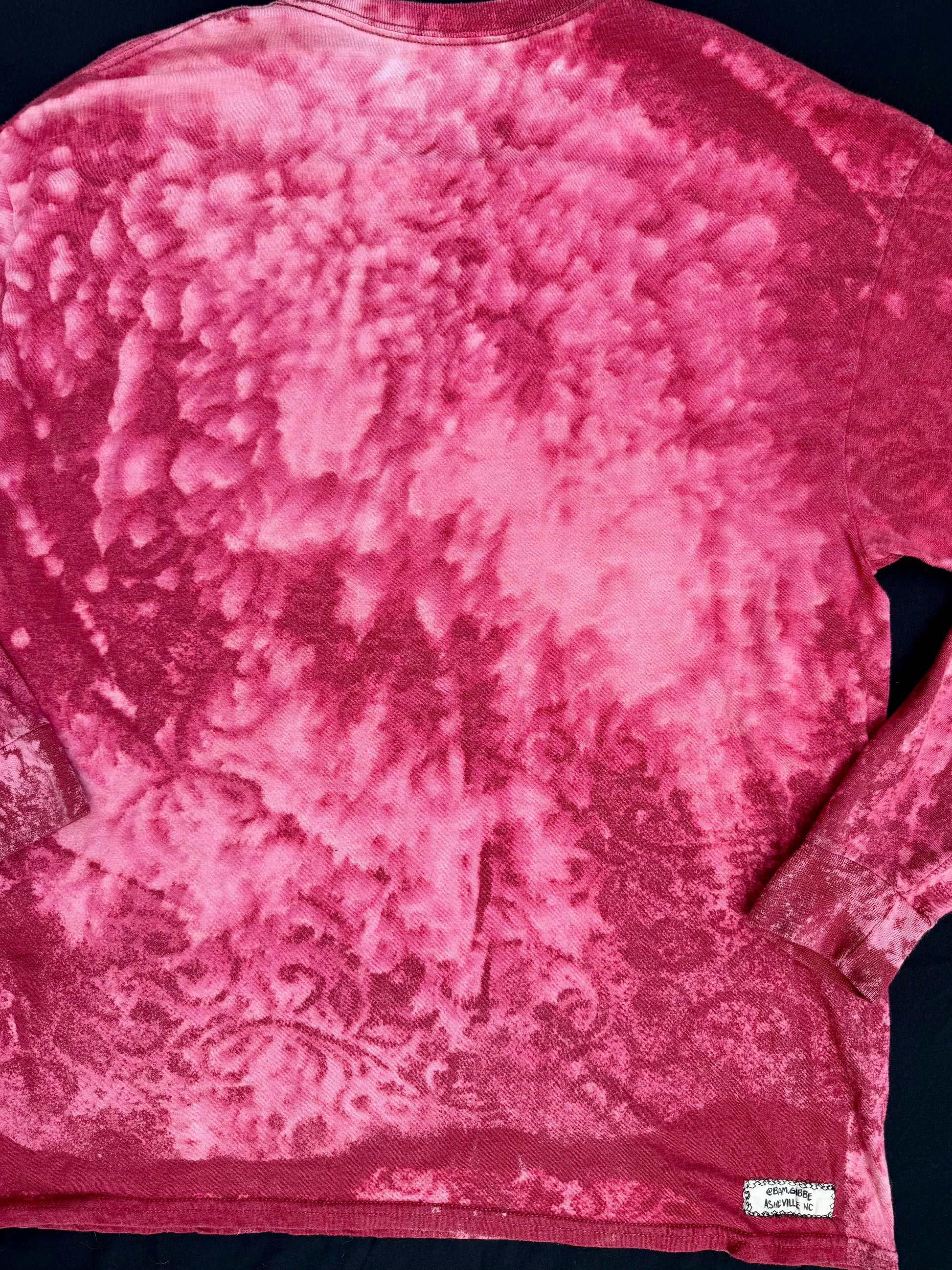 Sewn onto t-shirt bleach dyed with vintage lace by Bam.
