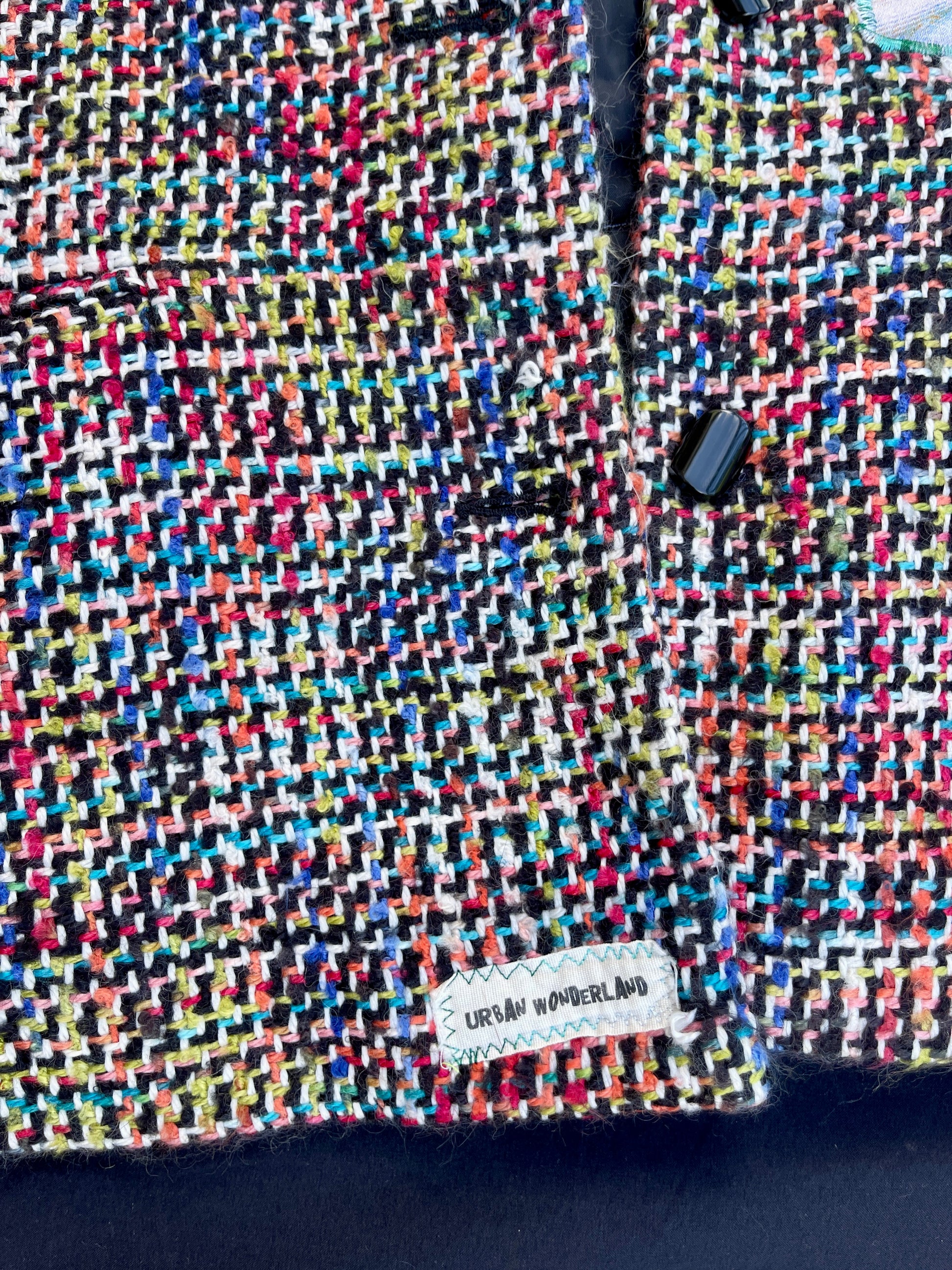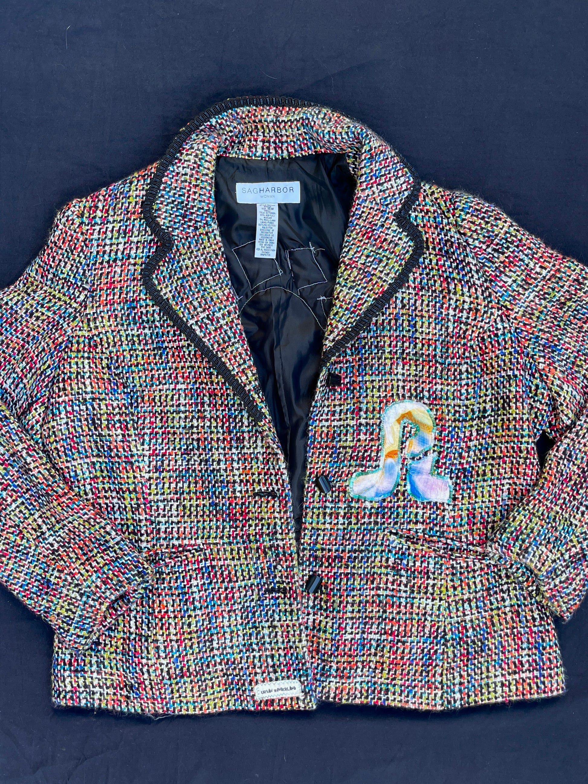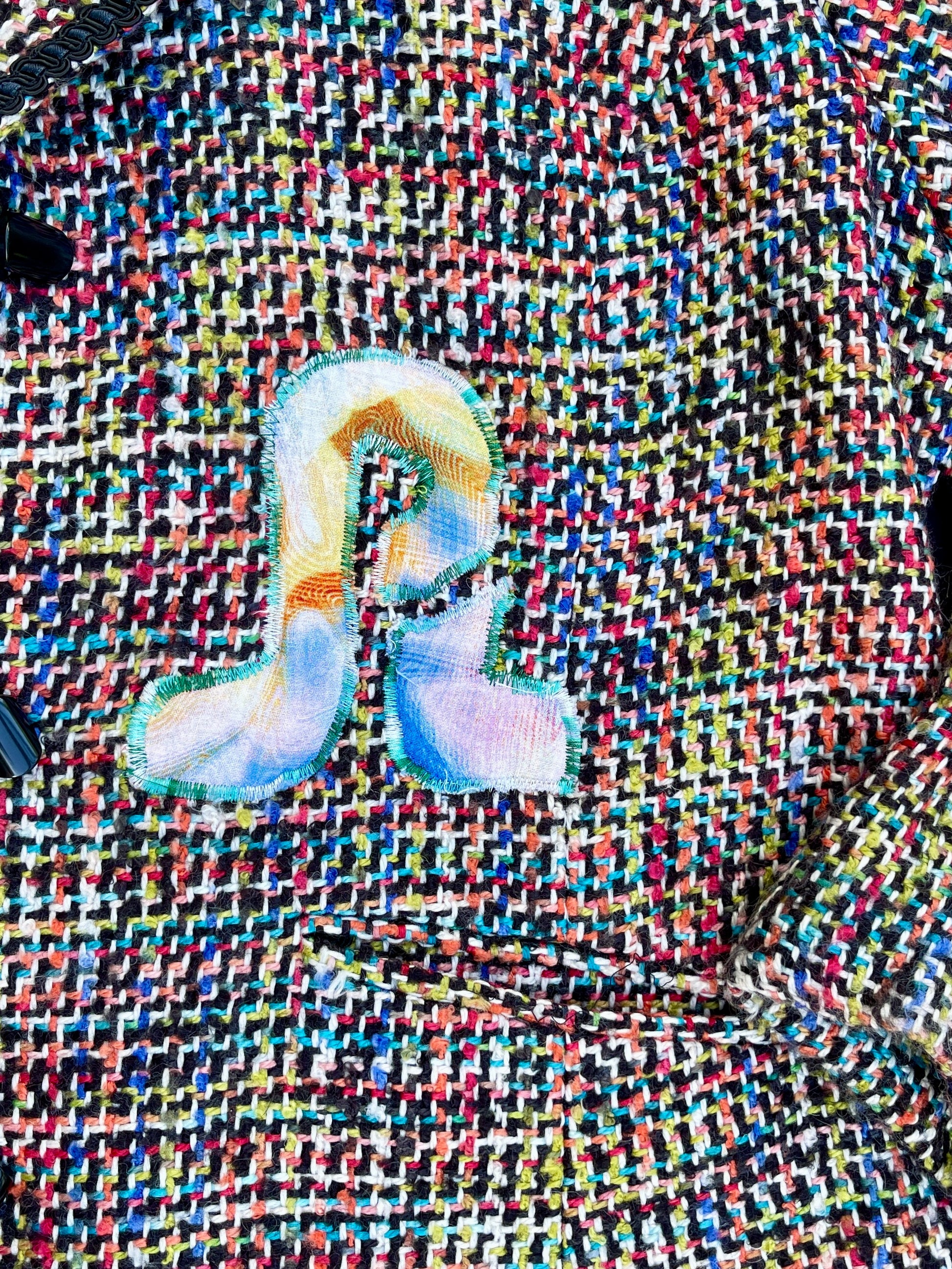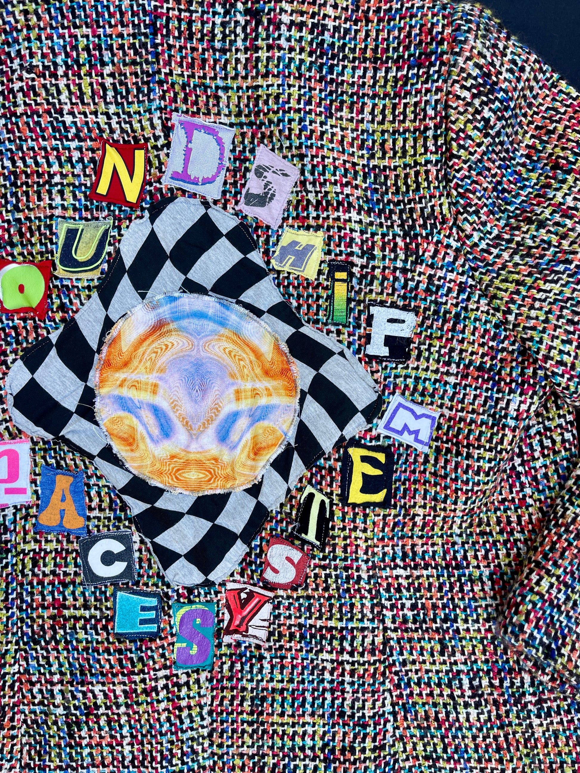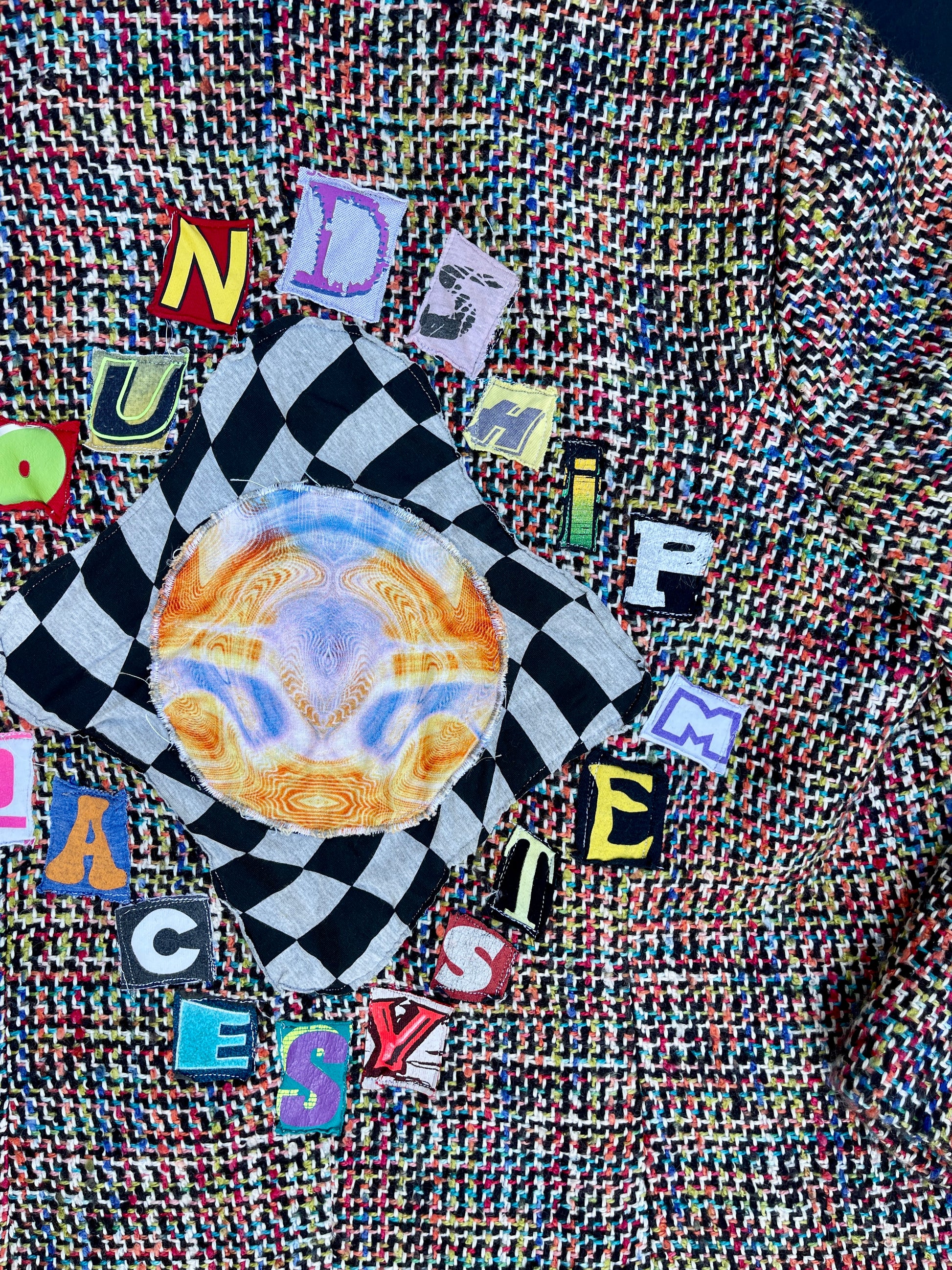 Thrifted jacket featuring letters cut out of various clothing items to spell "sound system spaceship". Patches created from scrap fabrics all sewn on by Bam.