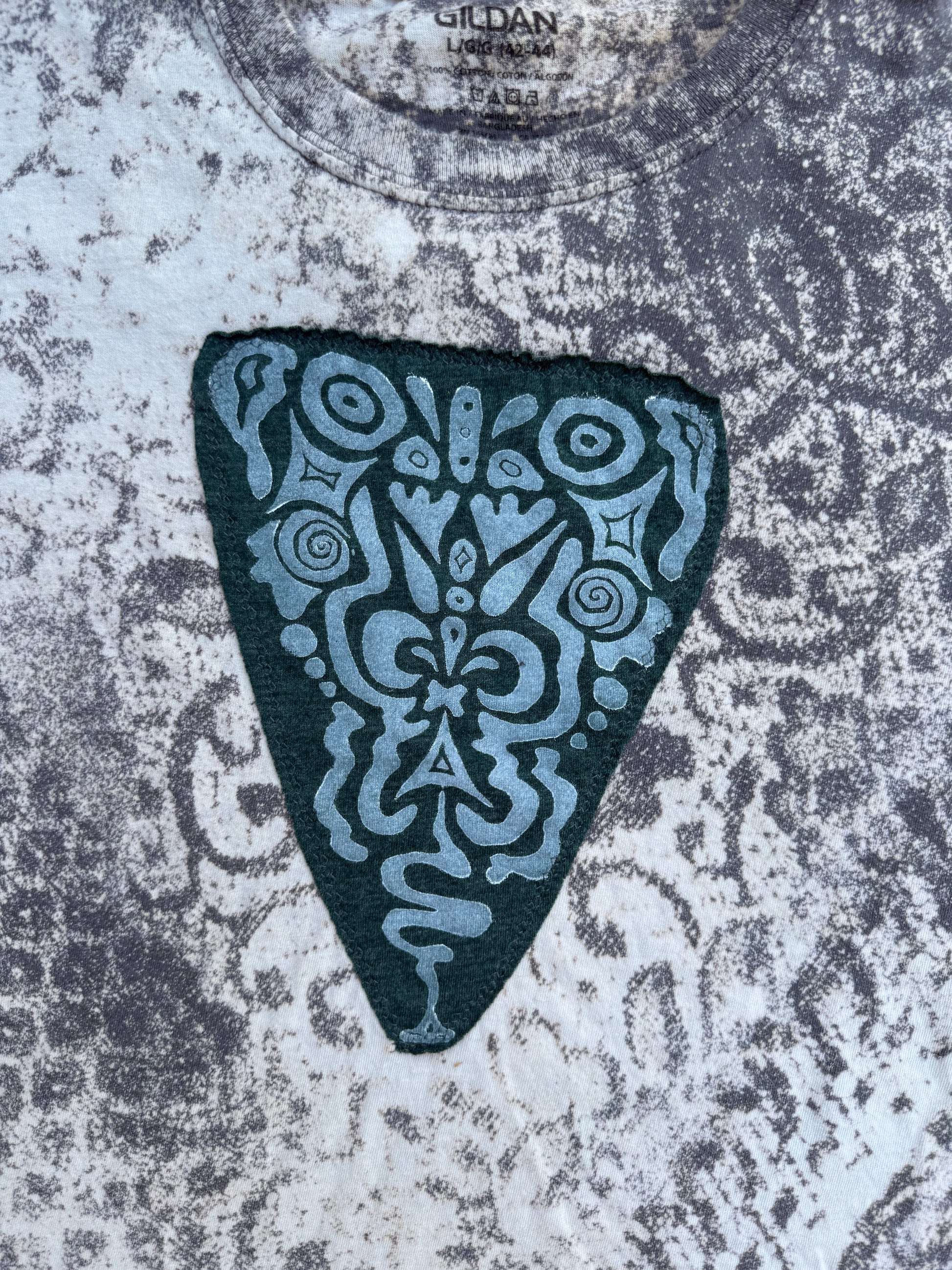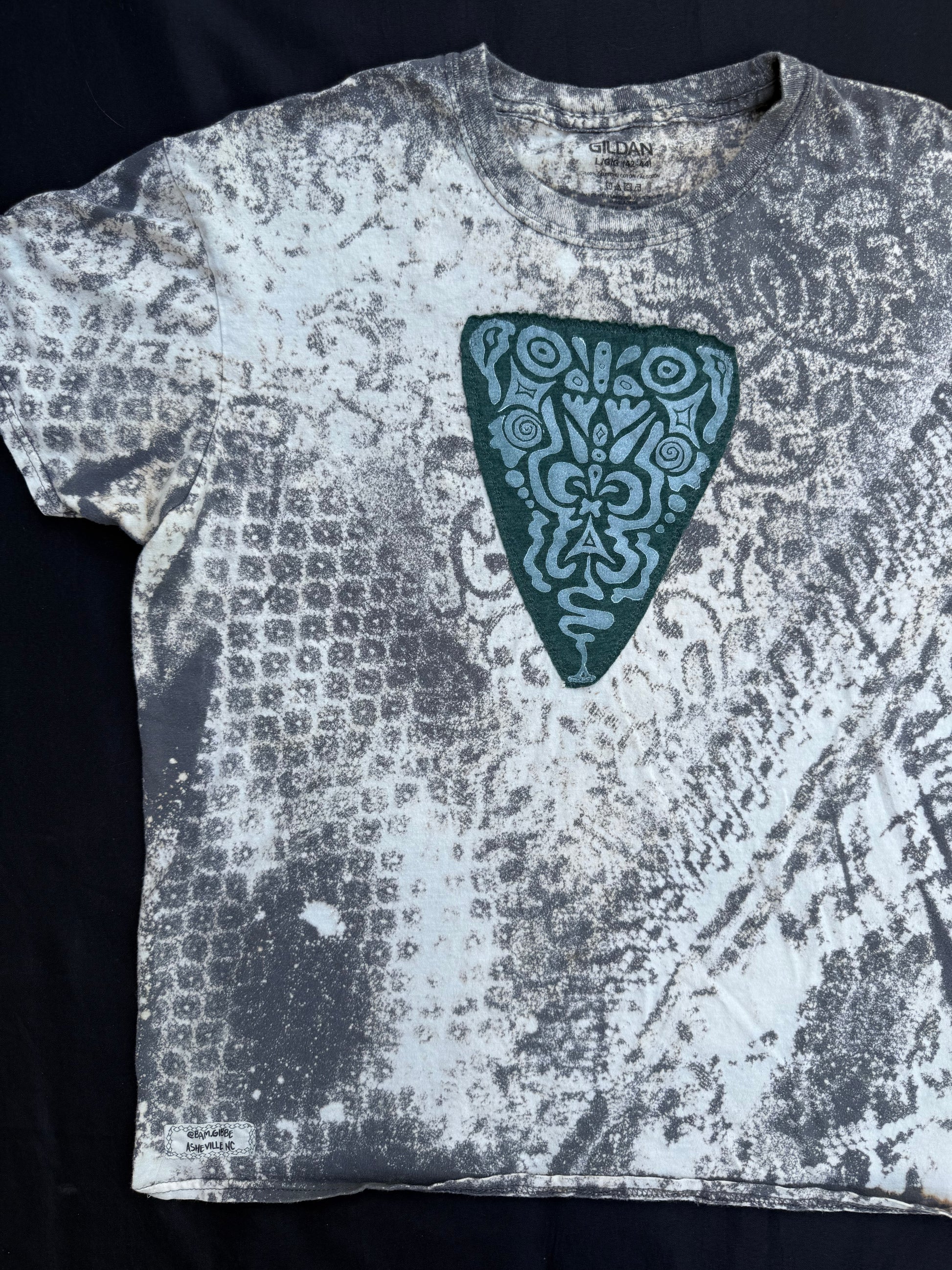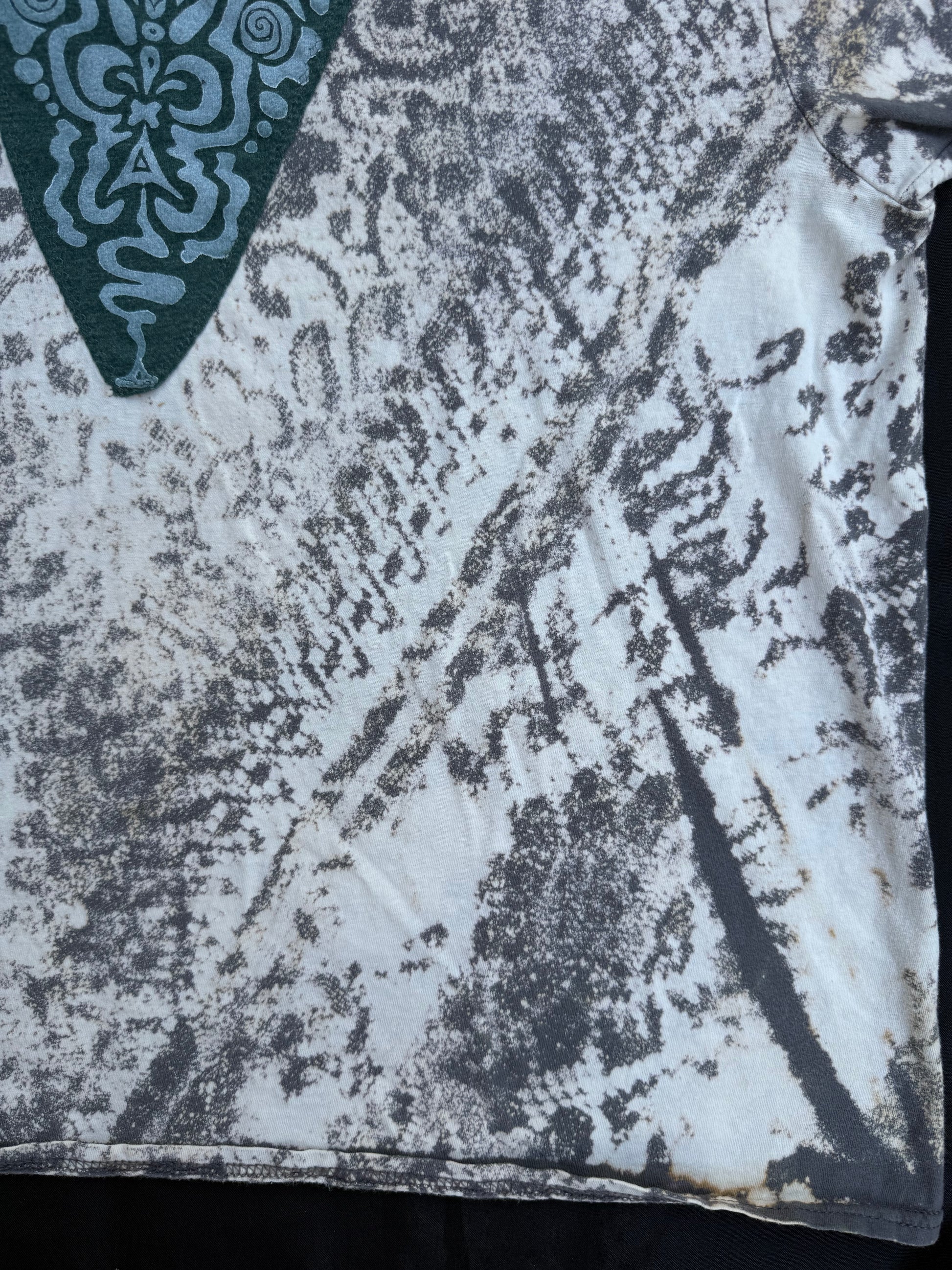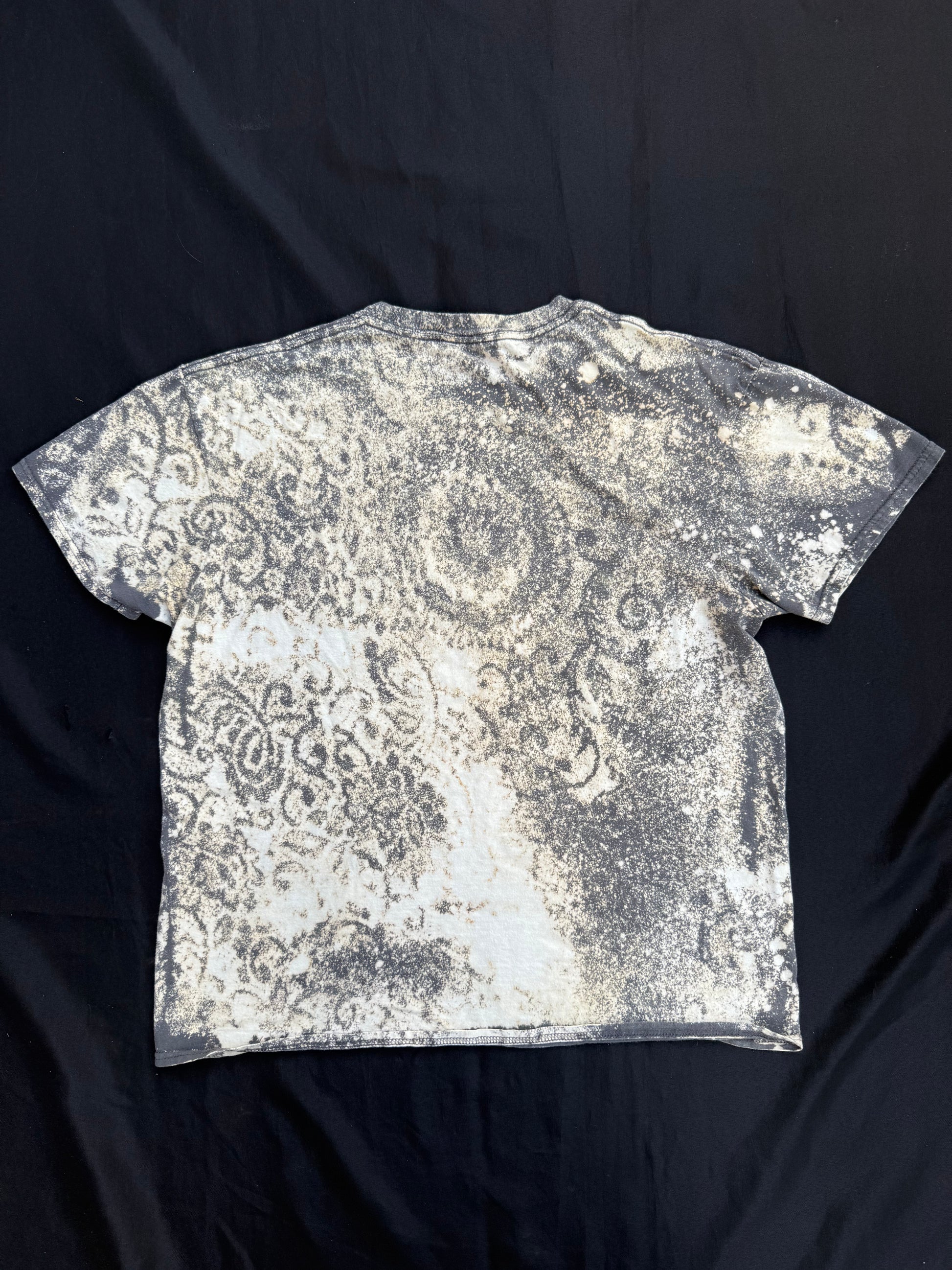 Sewn onto t-shirt bleach dyed with vintage lace by Bam.