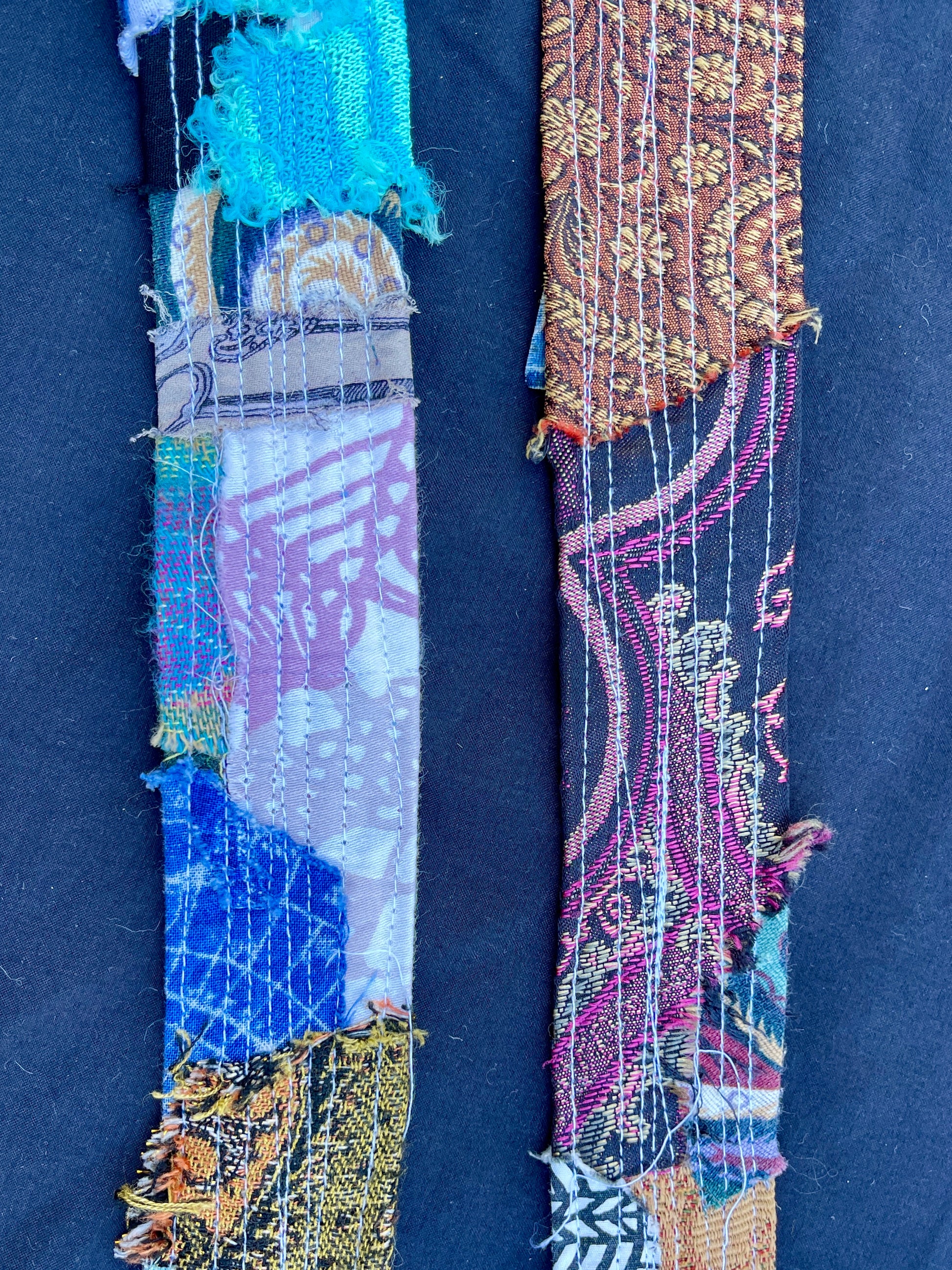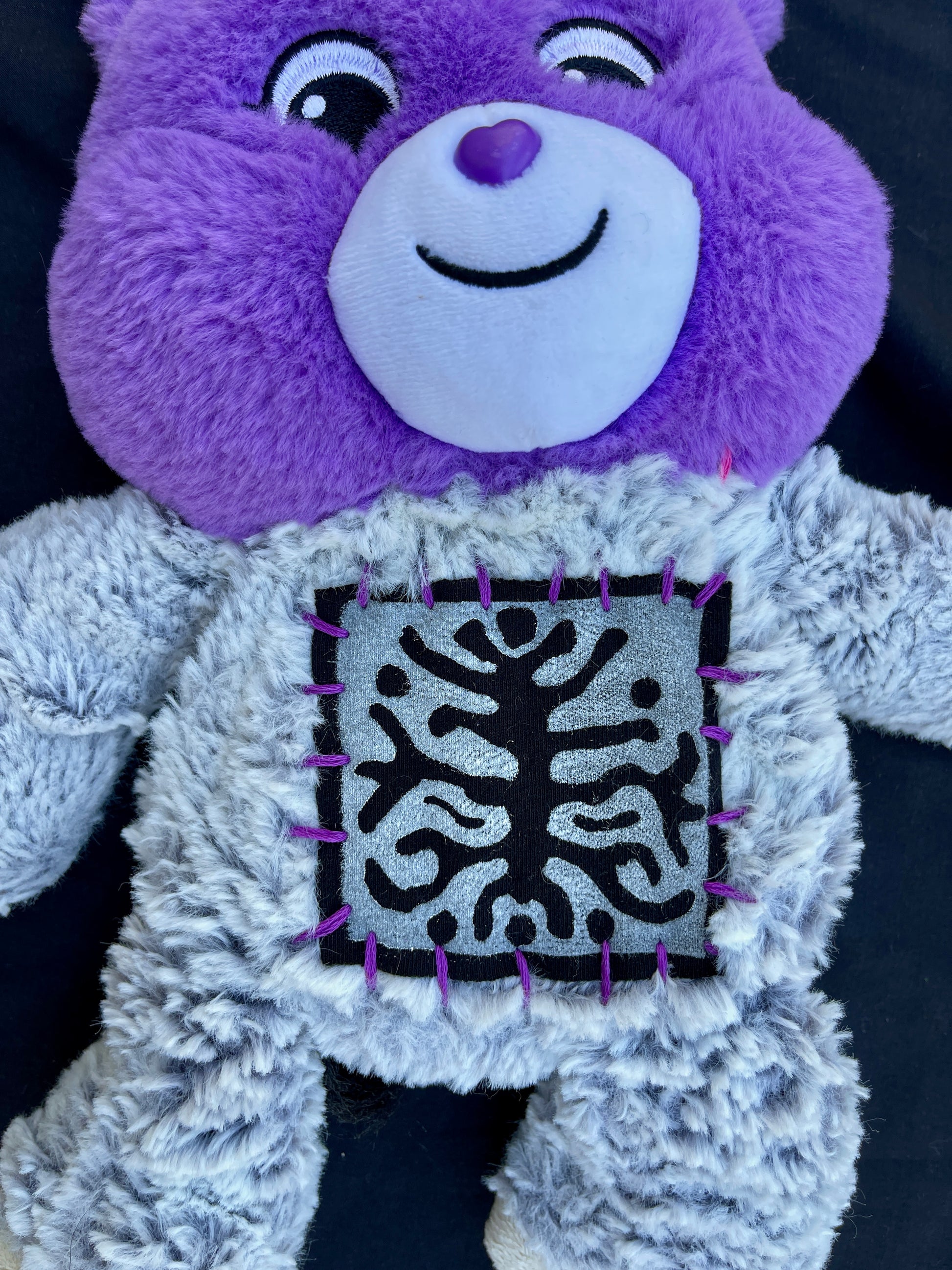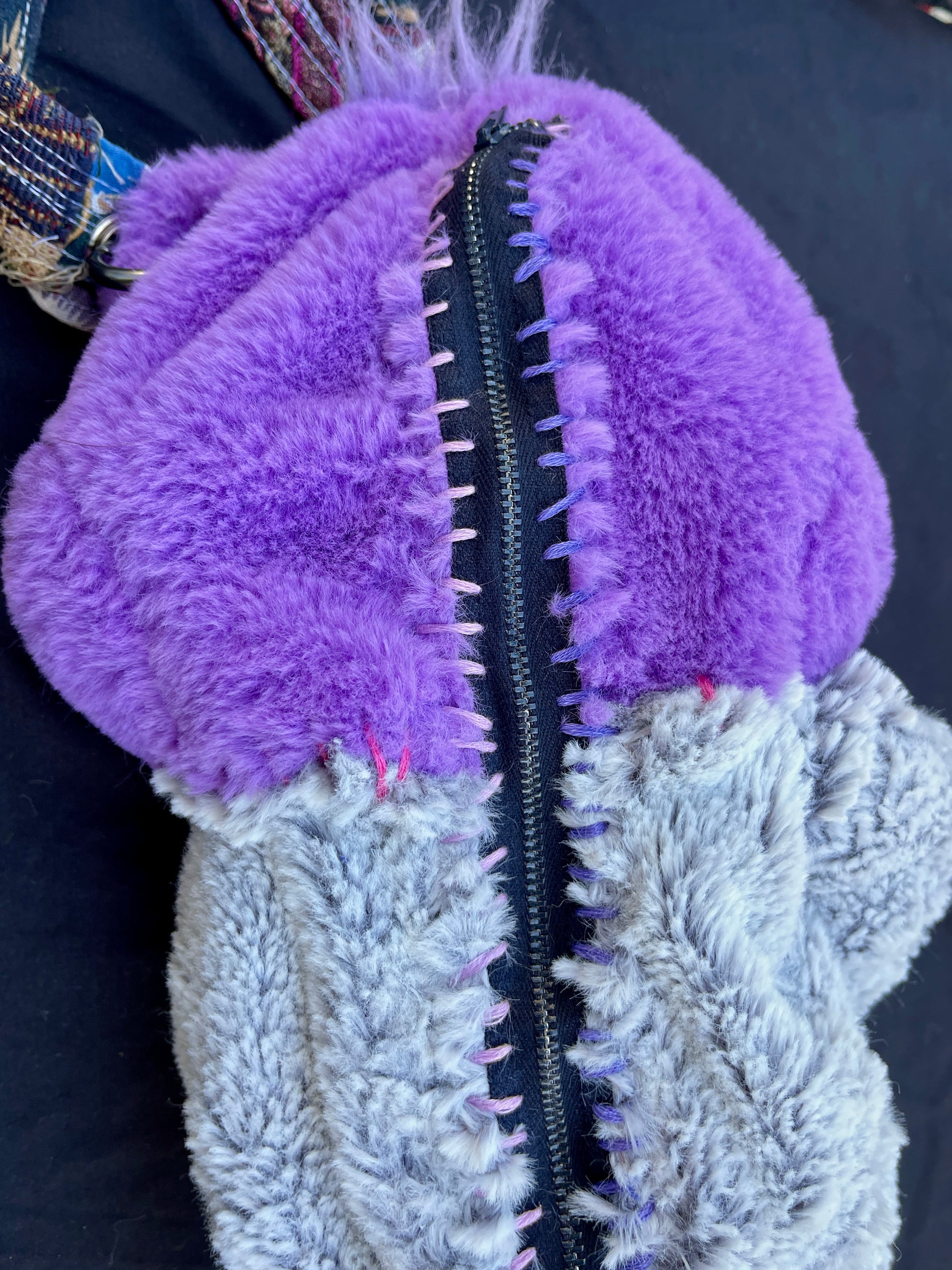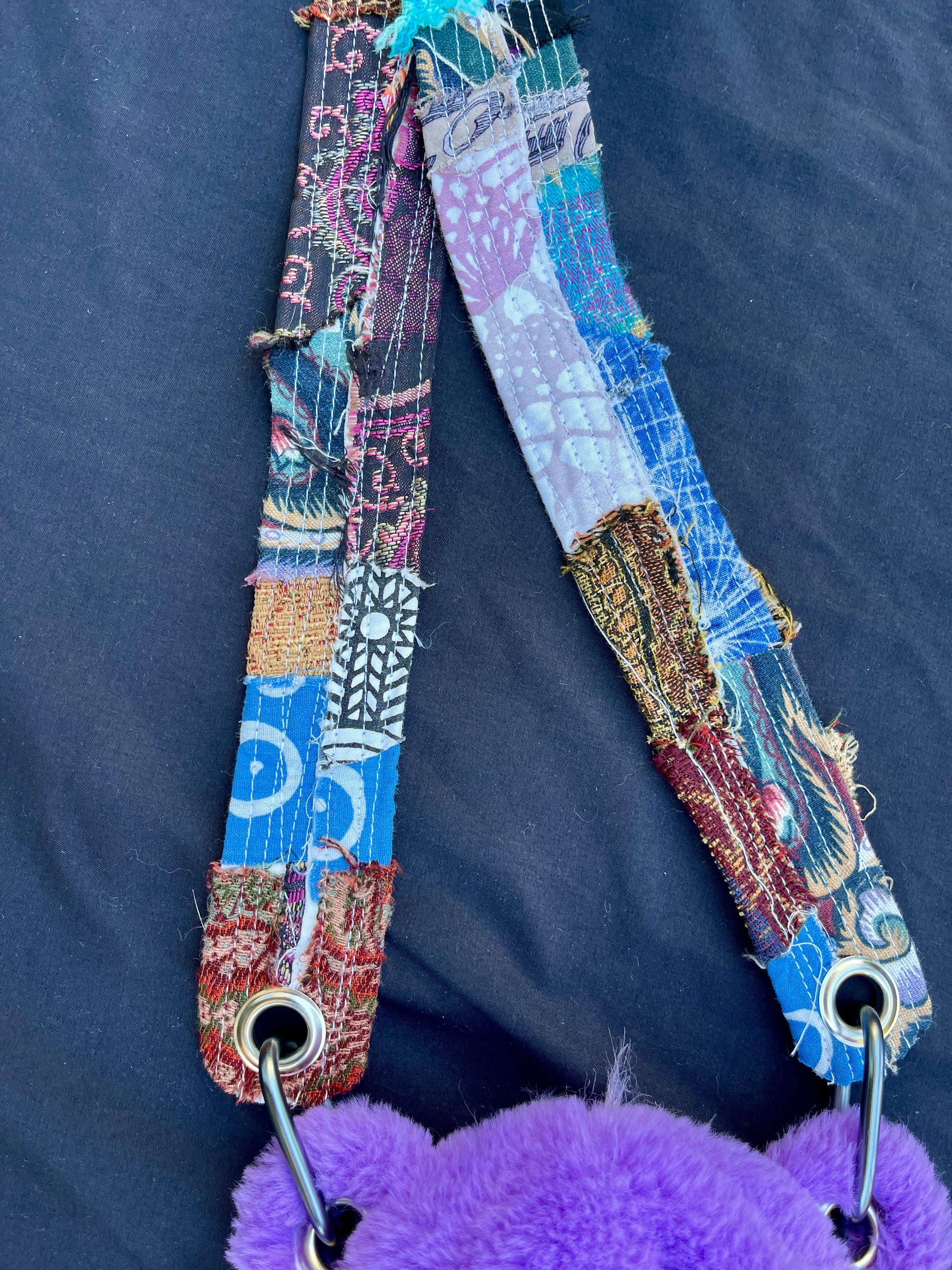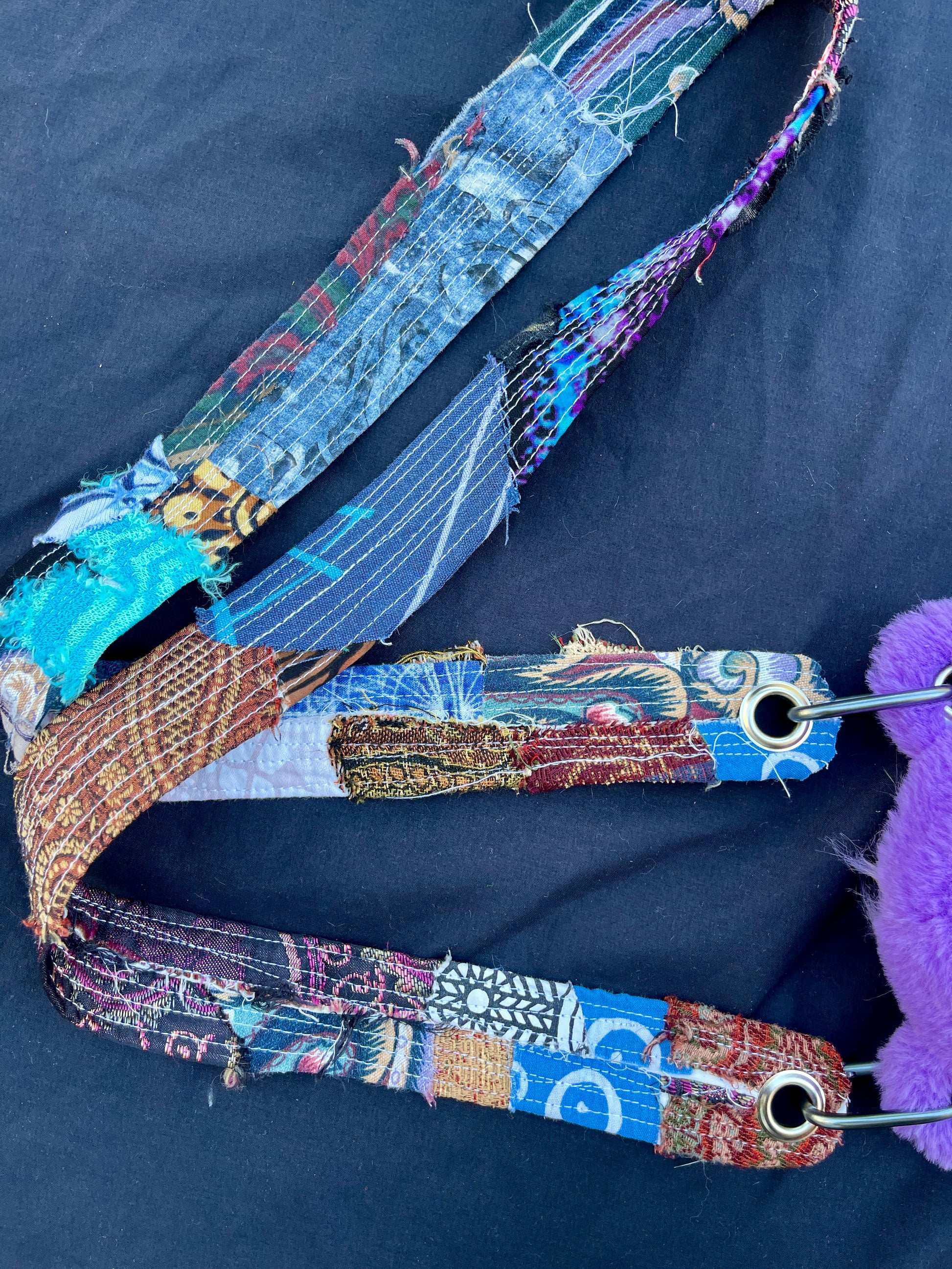 Linoleum block patch designed, carved and printed by Gibbe. Hand sewn onto bag.