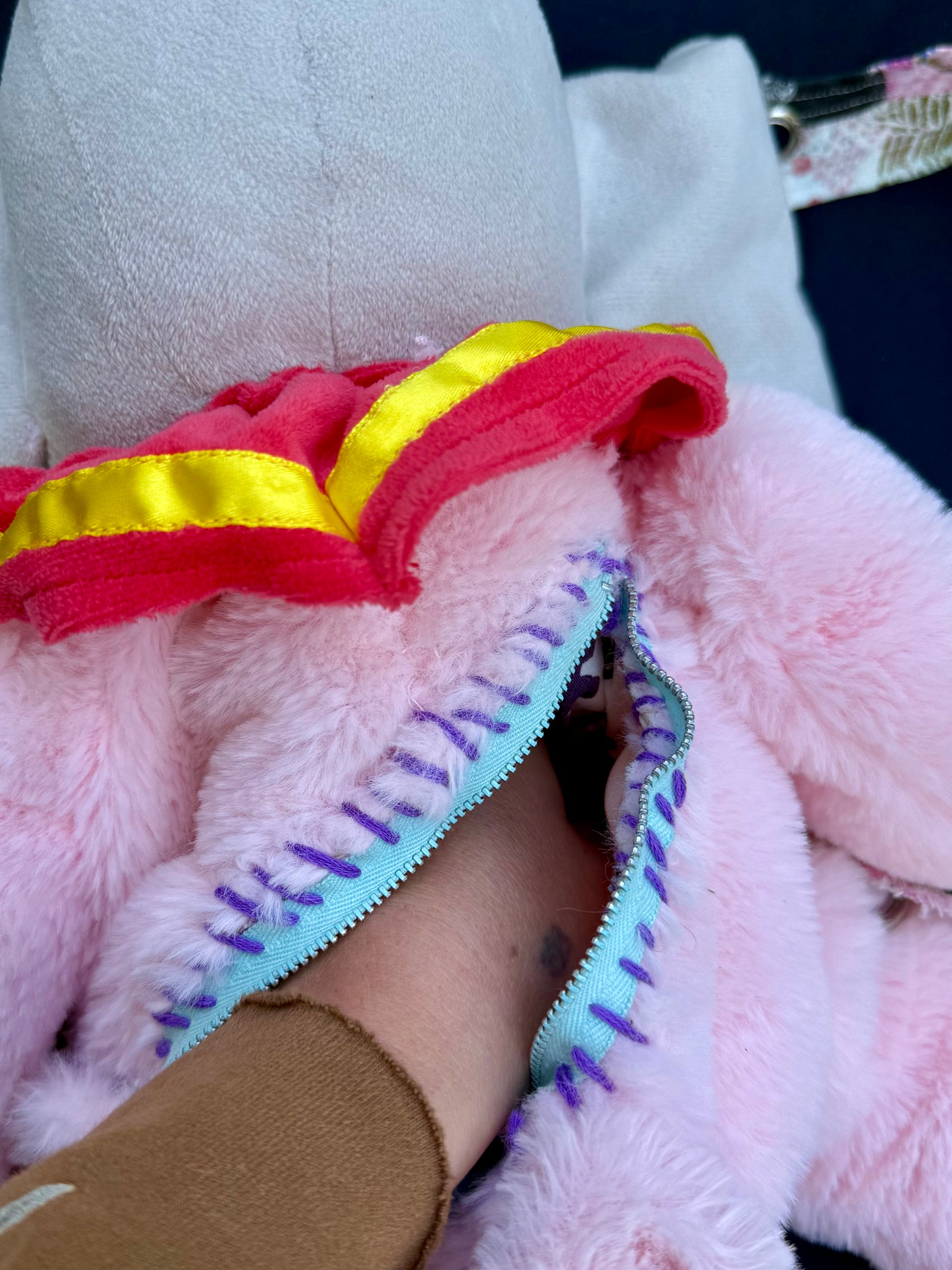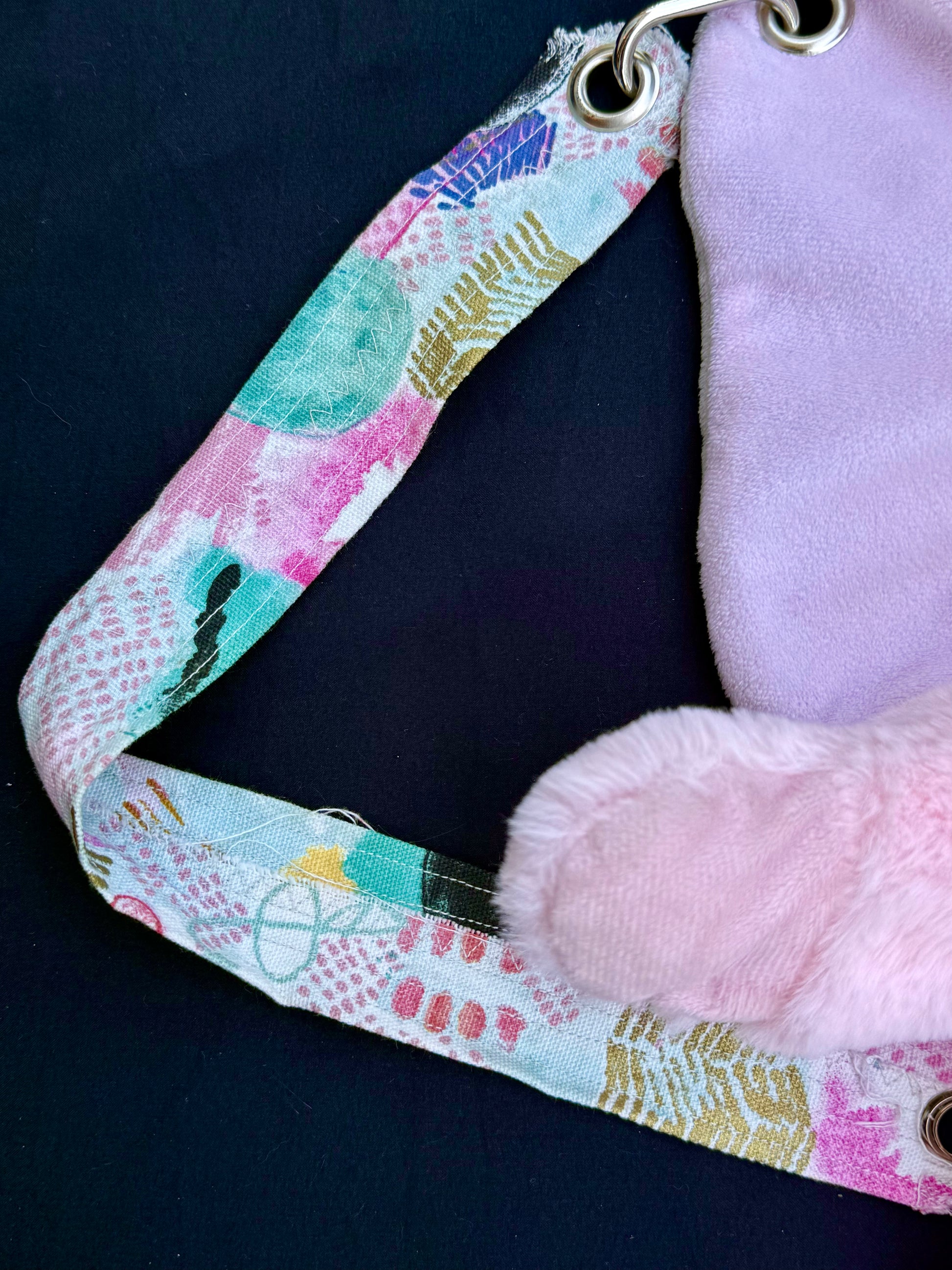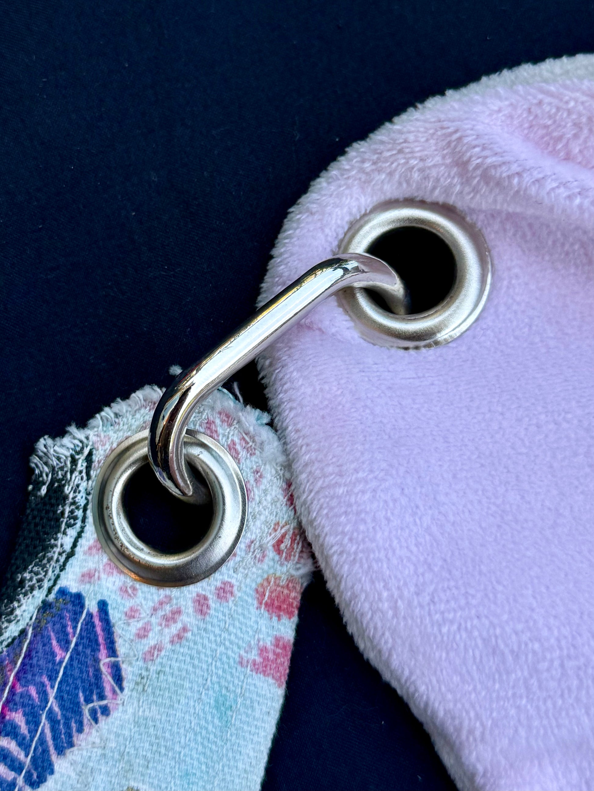 Linoleum block printed patch designed, carved and printed by Gibbe. Hand sewn onto bag.