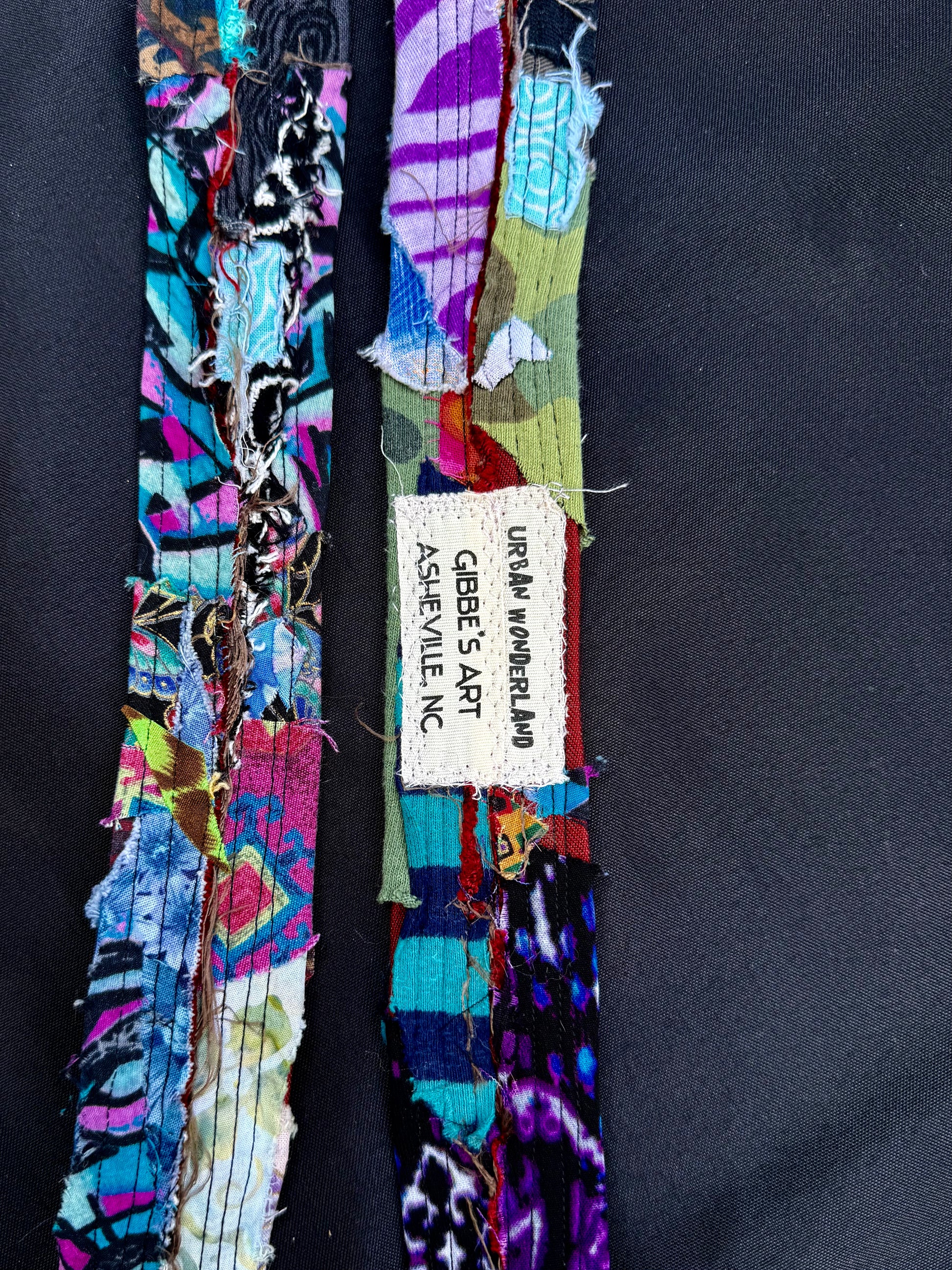 Linoleum block patch designed, carved and printed by Gibbe. Hand sewn onto bag.